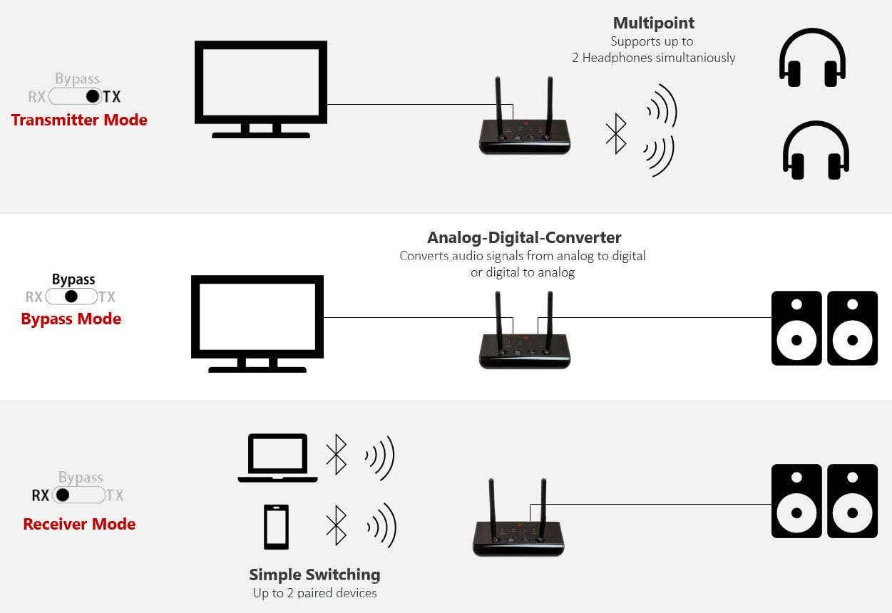 - Als Sender optimal für den Anschluss an TV oder Konsole, sendet Ton an Bluetooth-Kopfhörer, mit aptX Low Latency fast keine Latenz und ideal für Gaming, Live-Musik oder Fernsehen