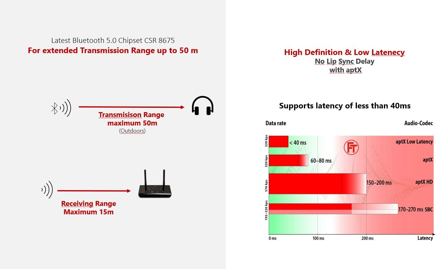 - Unterstützt alle alten und neueste Bluetooth Audio-Geräte mit SBC sowie aptX HD für hohe Audioqualität und aptX Low Latency für verzögerungsarme Audioübertragung