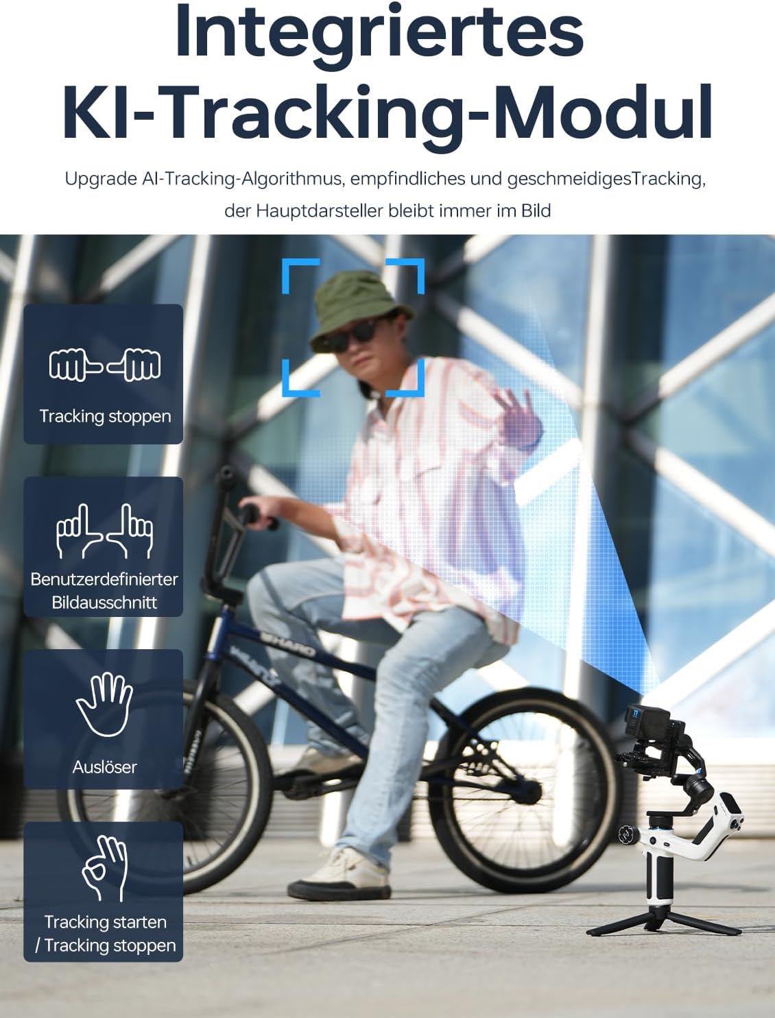 - AI-Tracking - Ohne zusätzliche Ausrüstung steuern Sie Aufnahmen, Videos und Tracking per Gestensteuerung und erfassen jeden Moment der kreativen Inspiration.