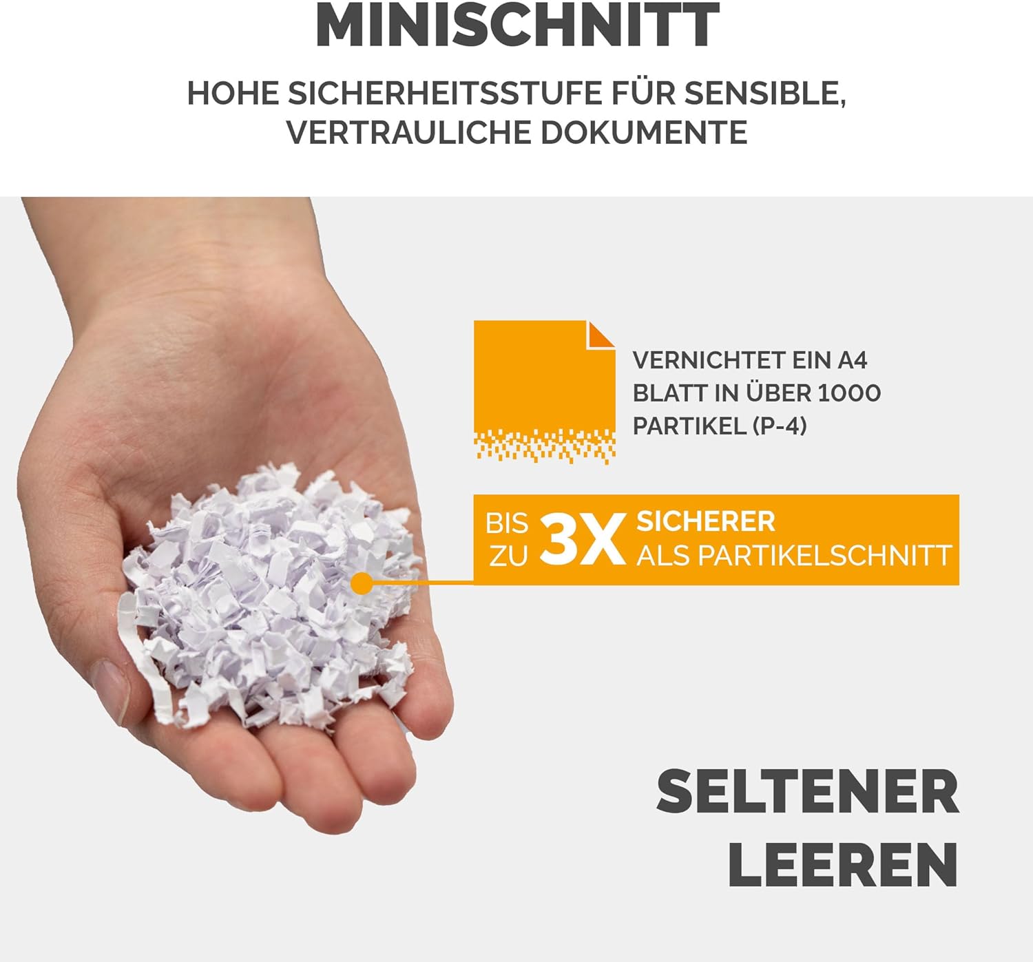 - MINICUT - Die sichere Vernichtung vertraulicher Daten im Home Office oder Büro ist beim 100M garantiert, denn er schneidet jedes A4 Blatt in über 1500 Mini-Partikel der Grösse 4 x 10 mm (Sicherheitsstufe P-4)