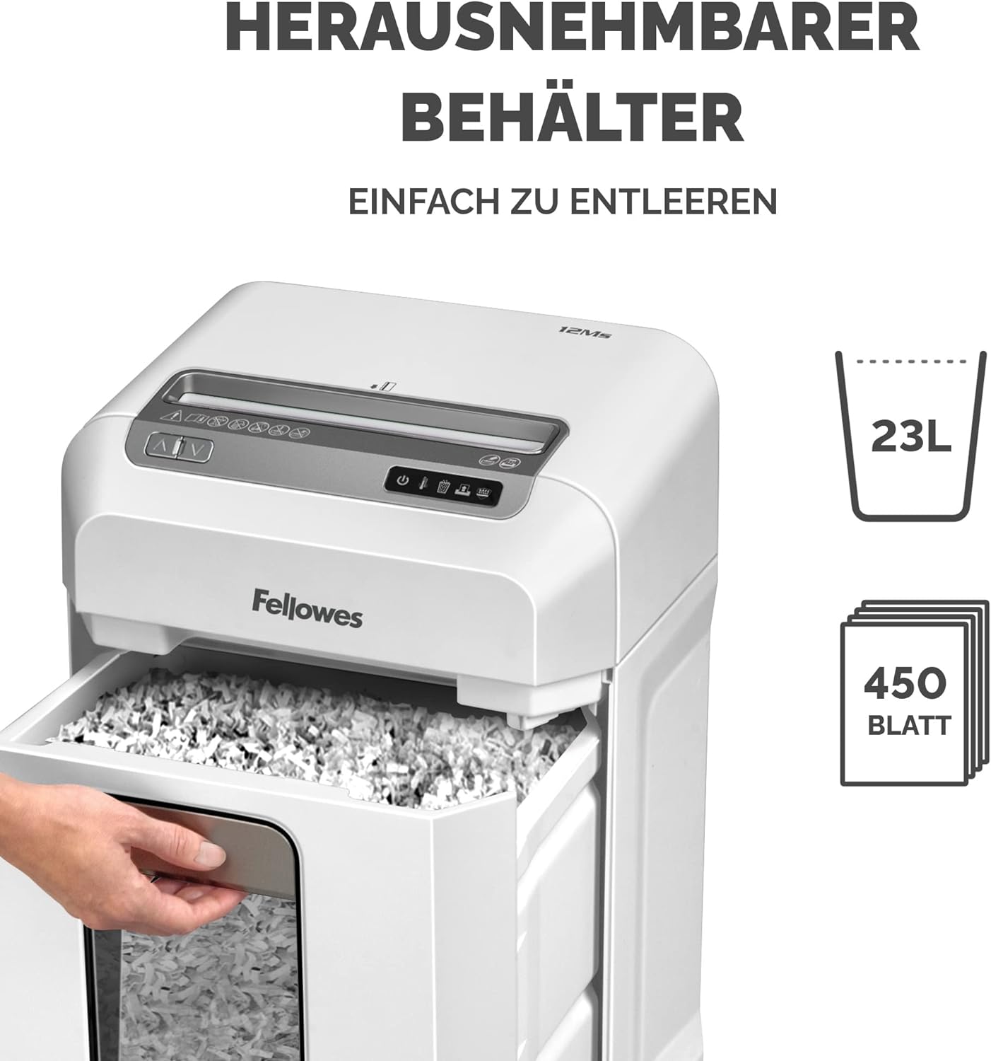 - FASSUNGSVERMÖGEN - Der grosszügige 23-Liter Papierkorb ist gross genug für häufiges Schreddern und dank der kleineren Mini-Cut Partikel fasst er bis zu 450 Blatt A4 und Sie müssen den Papierkorb seltener leeren.
