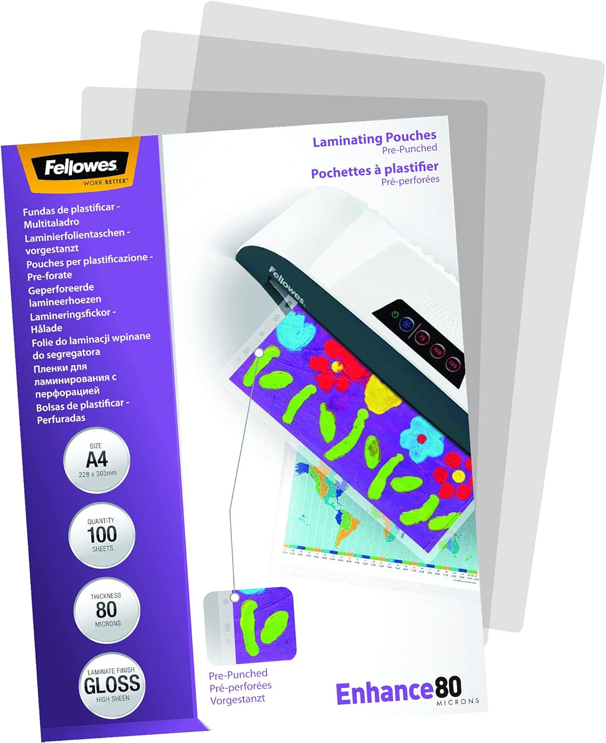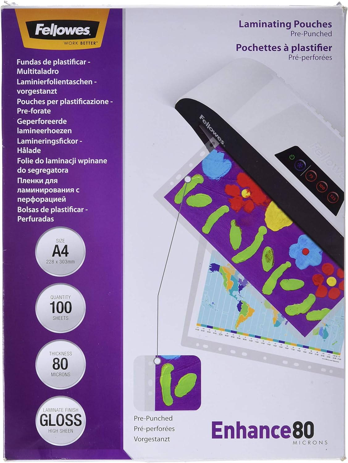 Fellowes Laminierfolien A4, 80 Mikron (2 x 80 mic), mit Lochung zum Einheften, glänzend, 100 Stück