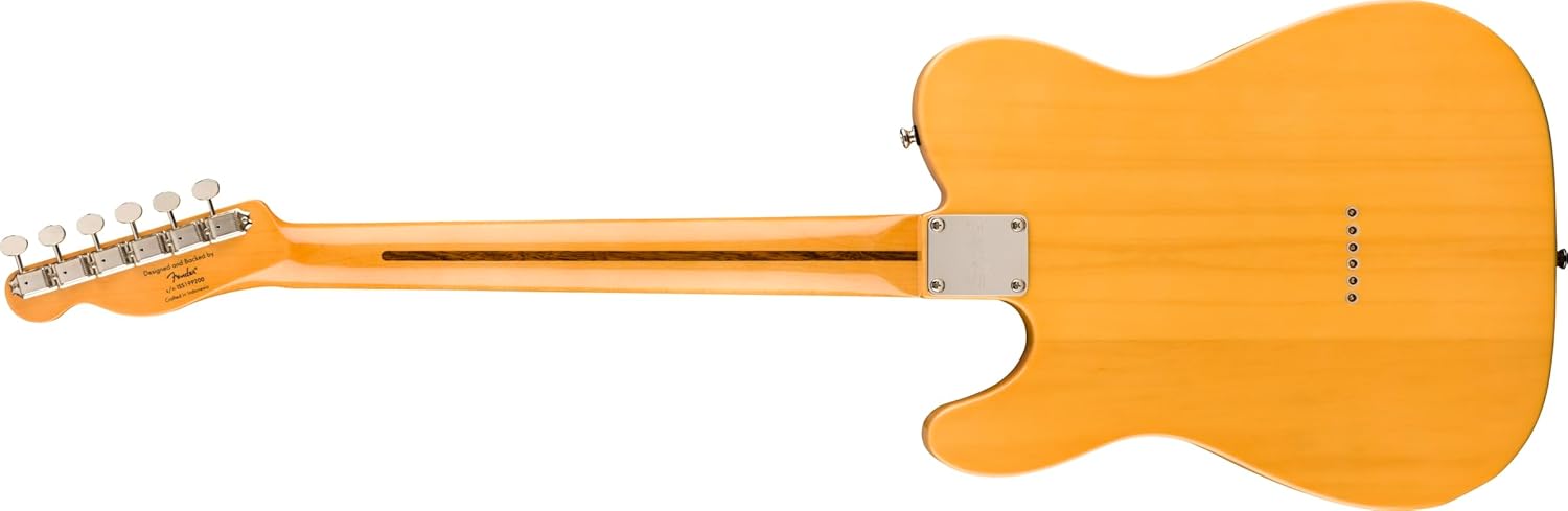 - Spielfreundlich ist sie auch: Auf dem schlanken Hals im C-Profil sitzt ein Griffbrett im 9.5” Radius mit Narrow Tall Frets. Die Saiten laufen durch den Korpus über eine Telecaster Bridge im Vintage-Stil mit Barrel-Saitenreitern. Die Retro Squier hat