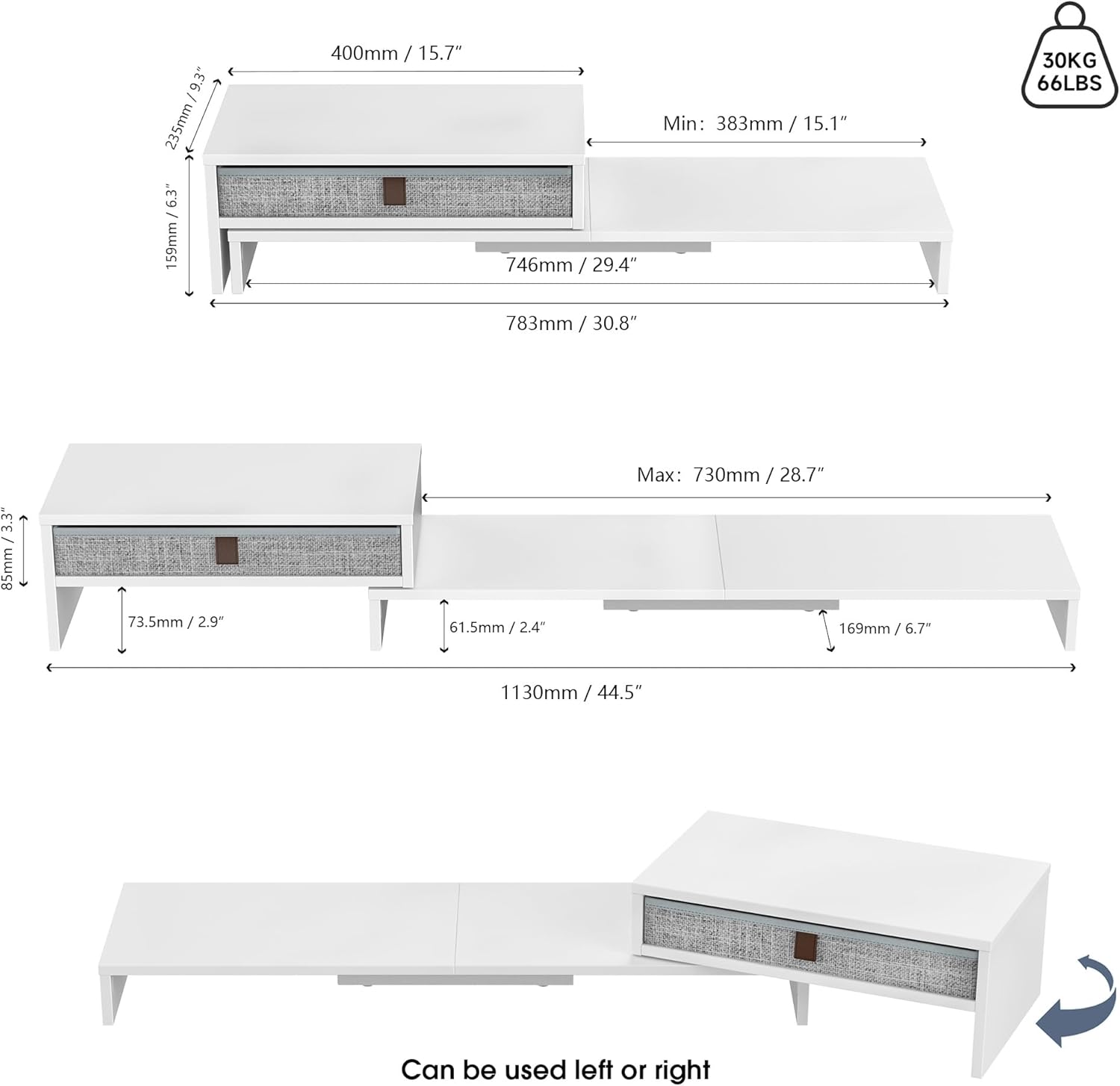 - 【Technisches Detail】Abmessungen: 78,3–113 cm (Länge) x 23,5 cm (Länge) x 7,3/15,9 cm (Höhe), maximale Tragfähigkeit: 30 kg.Hergestellt aus 12 mm mattem MDF-Panel, kratzfest, sehr leicht zu reinigen.