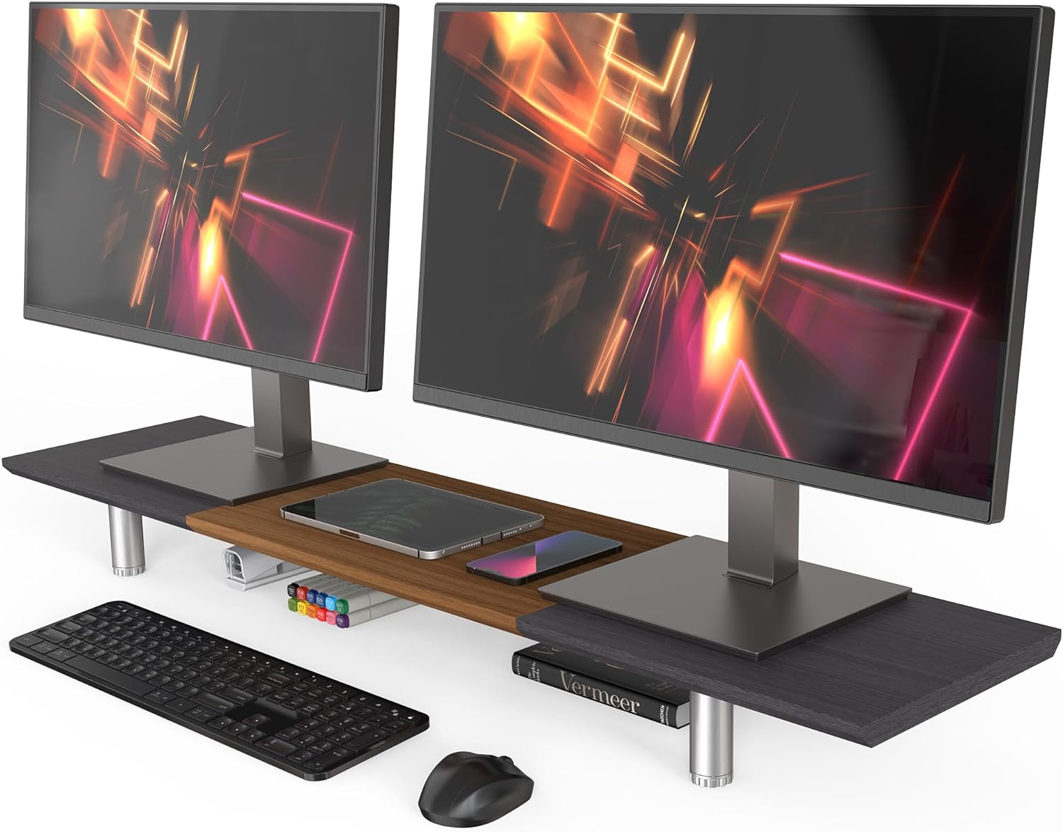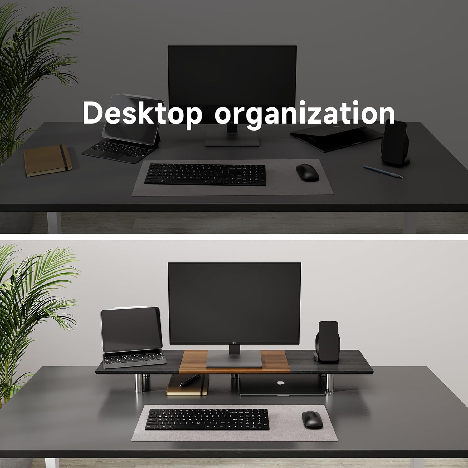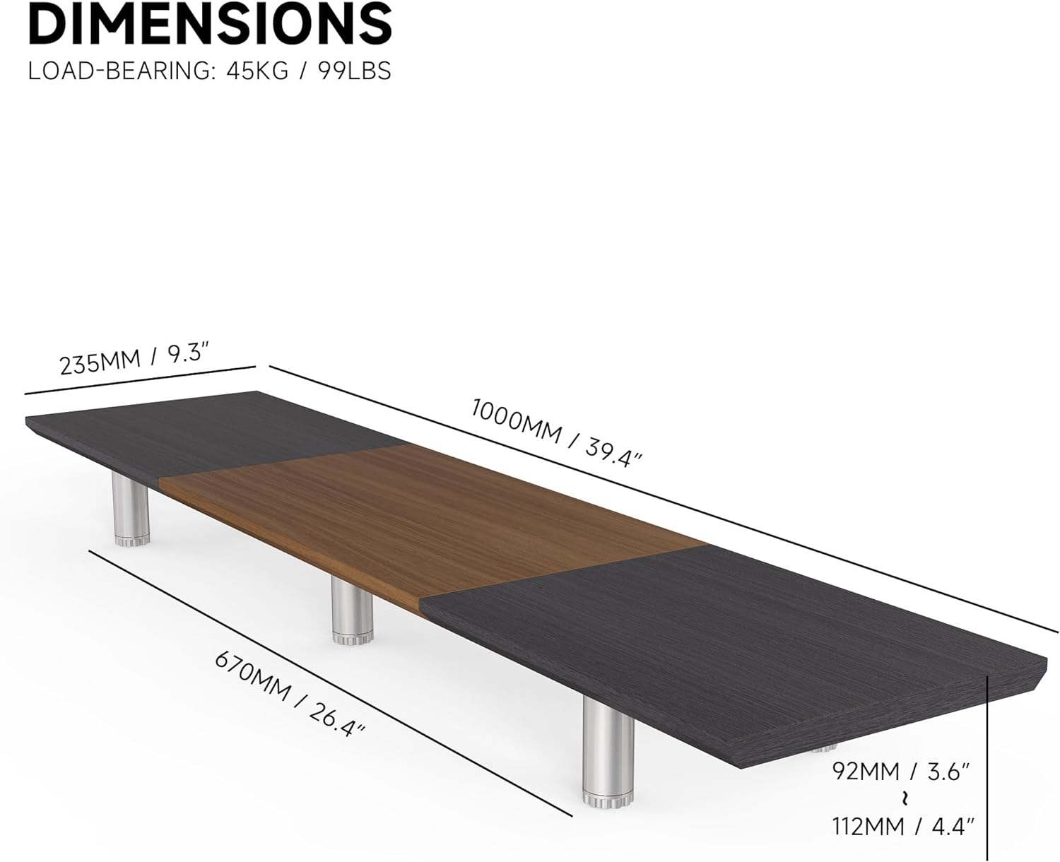 - 【Längere Grösse mit mehr Platz】Size: 100x23.5x(9.2-11.2)cm. Mit einer Breite von 100 cm ist dieser Laptop-Riser gross genug, um zwei Monitore zu unterstützen. Abhängig von Ihrem Setup haben Sie sogar Platz, um einen Lautsprecher oder ein anderes