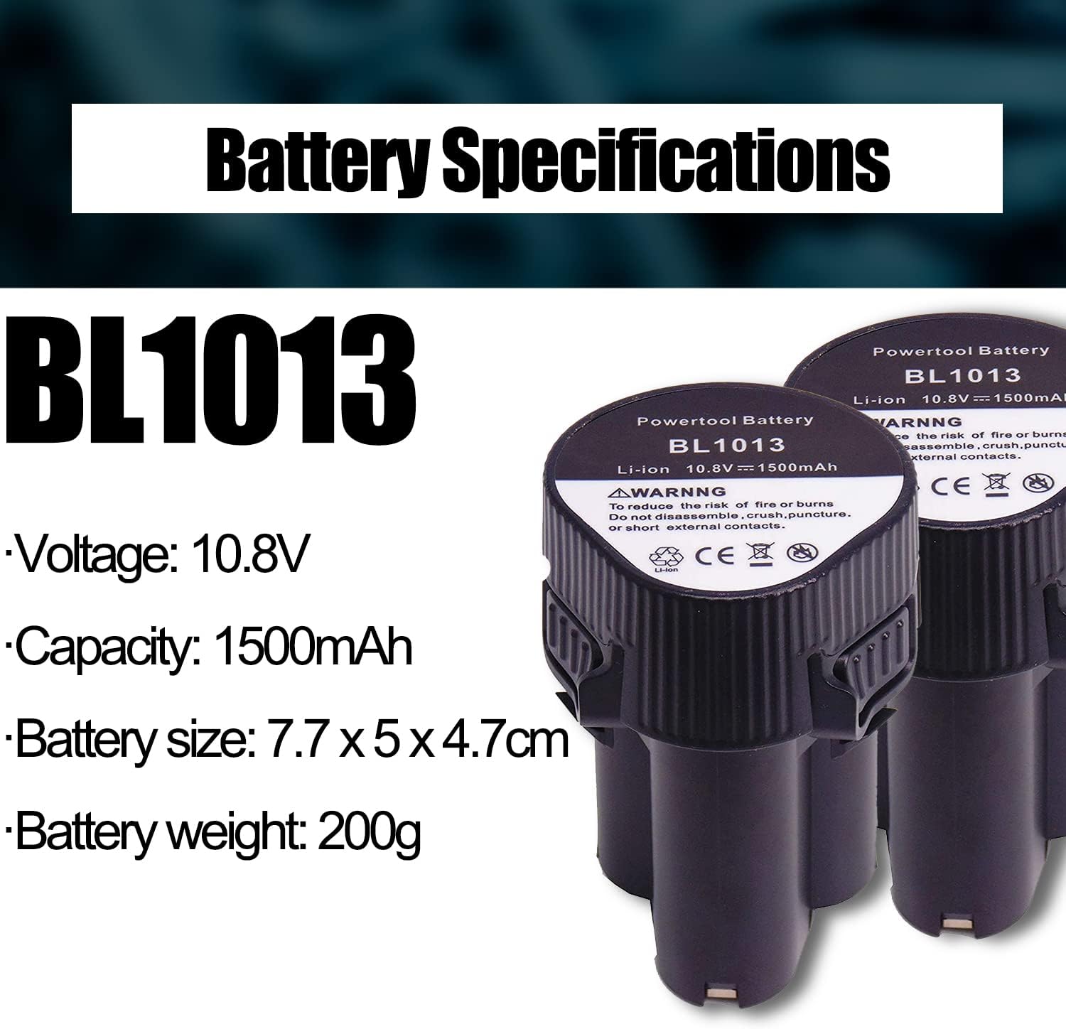- [PRODUKTSPEZIFIKATIONEN]: Dieser BL1013 Akku hat eine Kapazität von 1500Ah und die anwendbare Spannung ist 10.8V. Dank des hervorragenden Li-ion-Materials sich dieser wiederaufladbare Akku einfach und schnell aufladen.