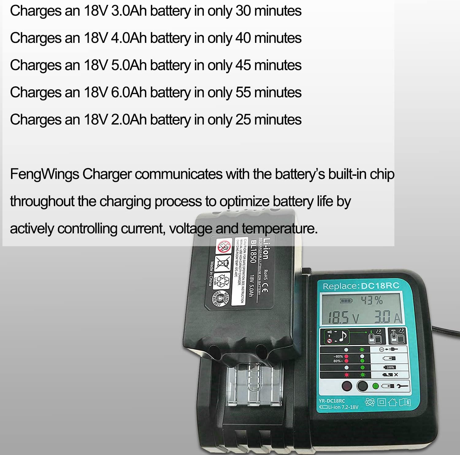 FengWings® BL1850B Akku 18V 5,0Ah mit 3A Ladegerät DC18RC Ersetzen für Makita BL1830 BL1840 BL1850 E