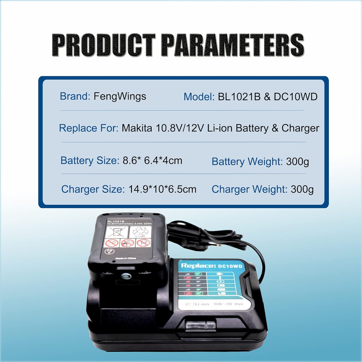 FengWings® BL1021B 2.0Ah Akku 2X Mit Ladegerät DC10WD DC10SB, Kompatibel mit Makita 12V Akku BL1016