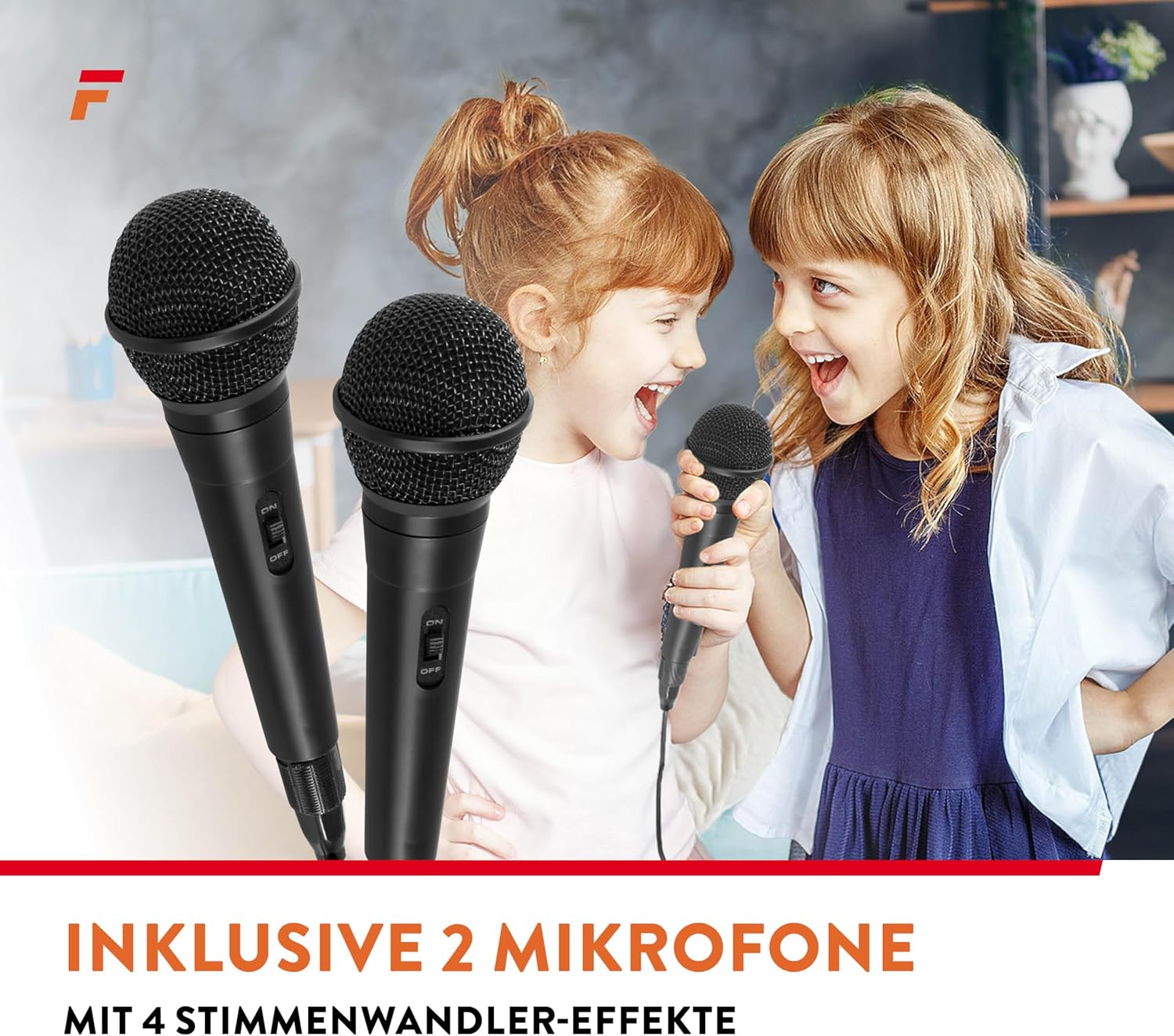 - Karaoke Set Kinder : Ausgestattet mit 2x AUX-Eingängen (3,5 mm Klinke) - perfekt für Ihre grossen Lautsprecher, 2 Mikrofoneingänge (6,3 mm) und einem USB-C-Ladekabel für bequemes Aufladen.