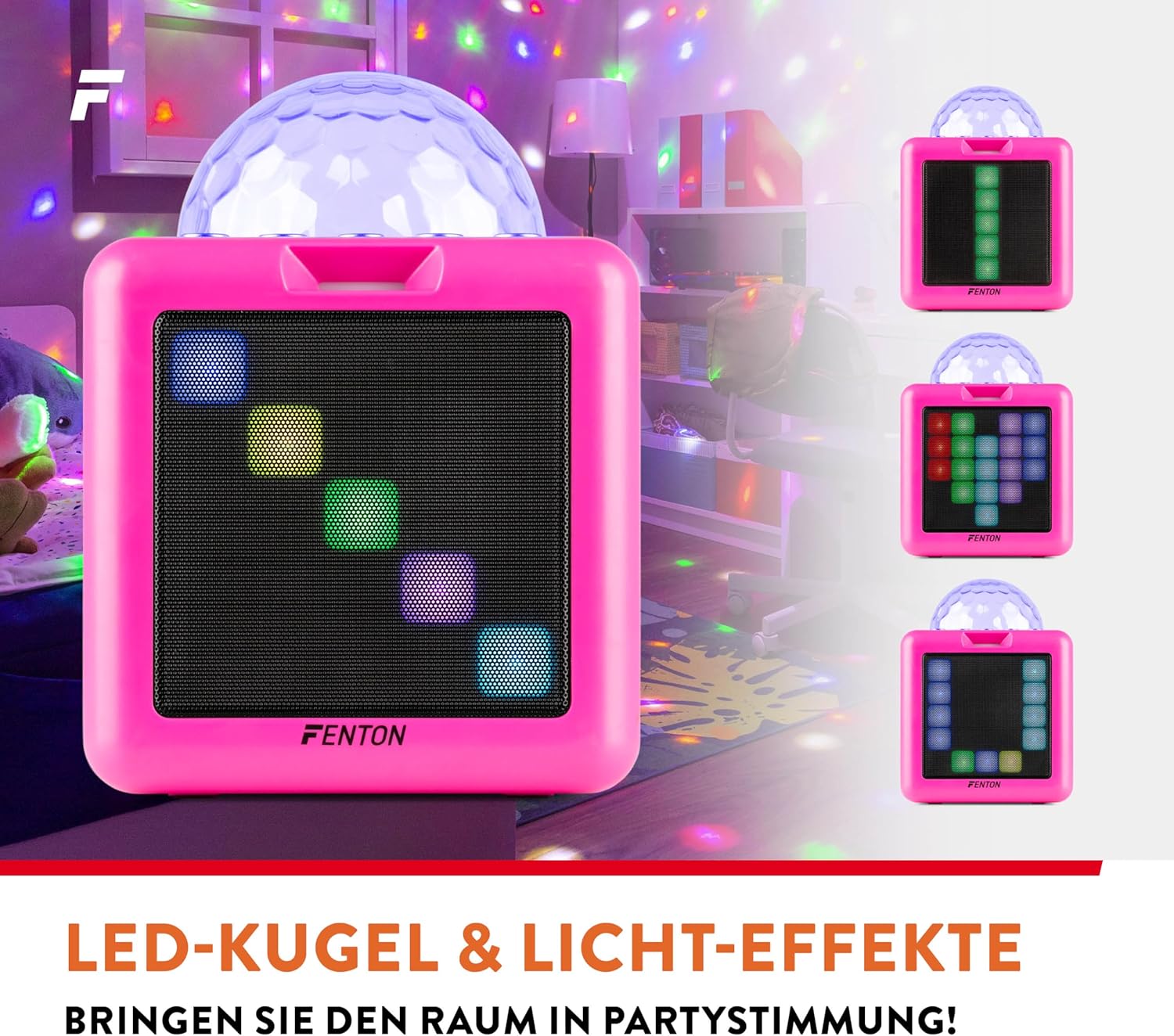 - Partybox Karaoke-Maschine : Farbige LED-Lichteffekte und ein Jelly Ball auf der Oberseite schaffen eine beeindruckende Lichtshow für echte Partyatmosphäre.