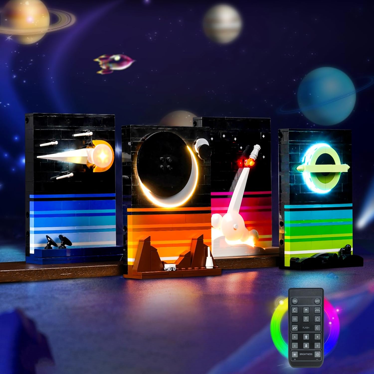 - Fernbedienungsversion: Design mit Fernbedienungsmodul und Fernbedienung. Sie können per Fernbedienung wählen, welches Teillicht geöffnet werden soll. Bringen Sie Ihr LEGO 21340 Ideas Tales Of The Space Age von der Dunkelheit ins Licht und erwecken Sie