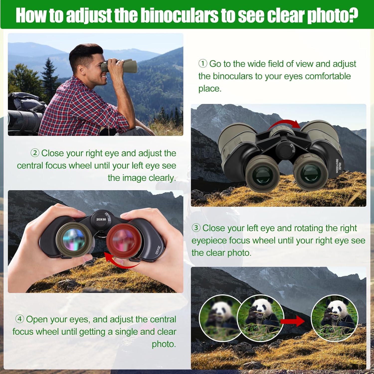 • 【Professionelles Fernglas】Dieses Fernglas mit 20-facher Vergrösserung, 50mm Objektiv, weites Sichtfeld für erstklassige Klarheit und Helligkeit. Ausgestattet mit einem 22mm Grünfilmokular und einem weiten Sichtfeld von 56m/1000m, perfekt für