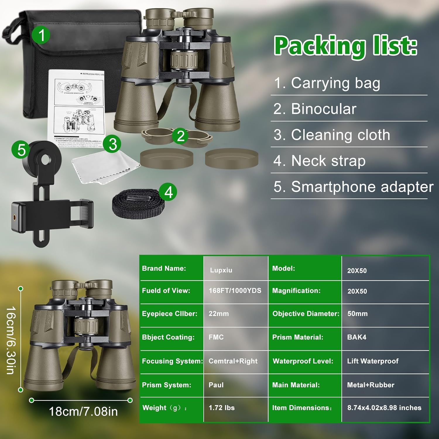 Fernglas für Erwachsene 20x50 mit Smartphone Adapte HD Fernglas mit FMC Objektiv Lens Leistungsstark