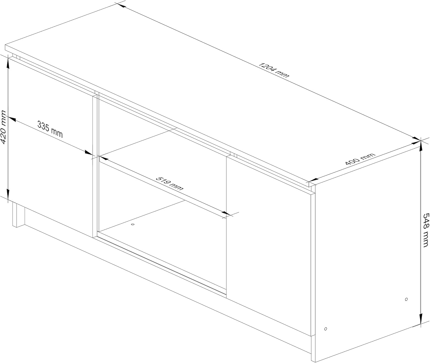 - Moderner TV-Schrank: Optimale Abmessungen H55 x B120 x T40 cm, laminierte, starke Möbelplatte 16 mm, zwei Ablagen mit grifflosen Türen links und rechts, dazwischen ein offenes Regalfach, robuste Metallscharniere.