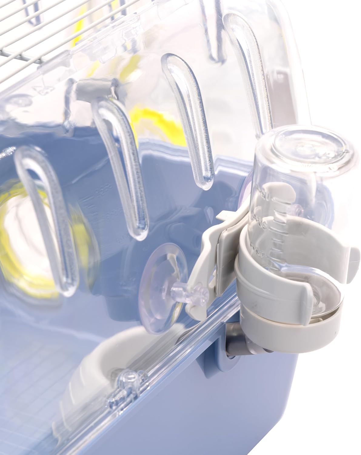 - Hamsterkäfig mit transparentem Kunststoffdach für die bessere Sichtbarkeit des Tieres, mit Gittereinsatz im Dach und grossen Schlitzen für eine gute innere Belüftung