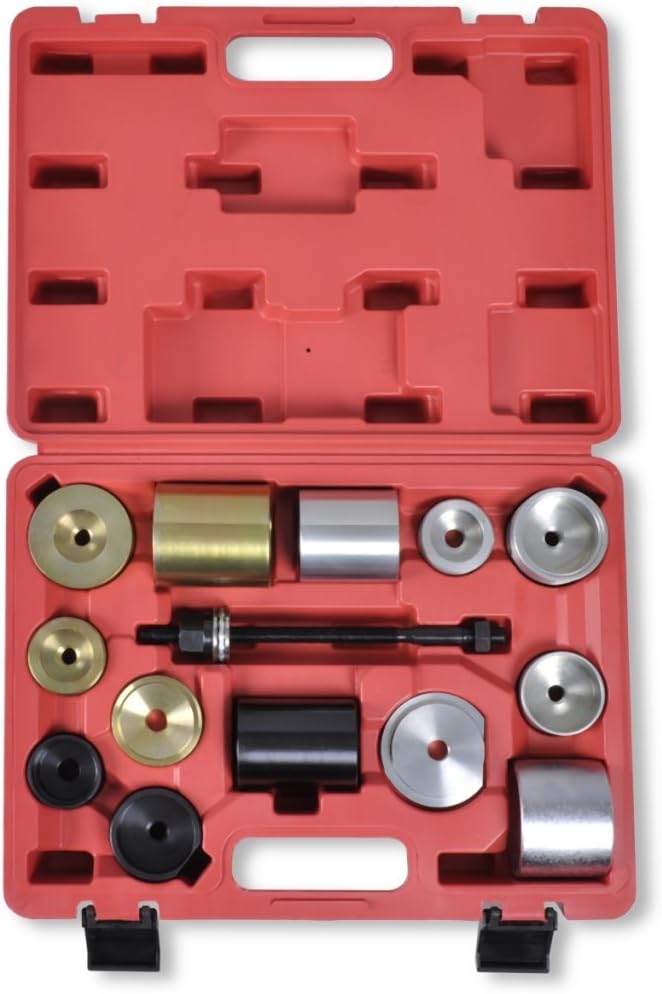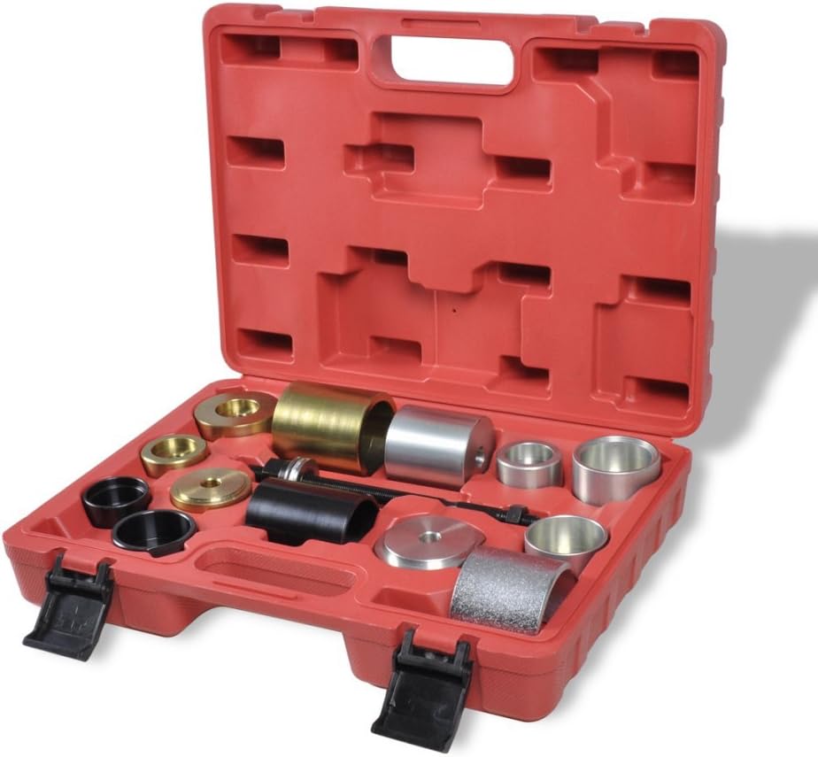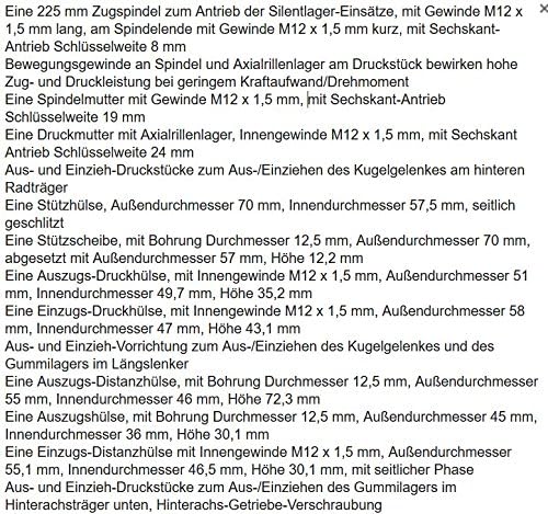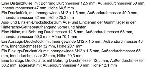 - Silentlager-Werkzeugsatz für BMW, 16-teilig; Ermöglicht den Austausch von Gummibuchsen/-lagern von Radaufhängungen; Beinhaltet verschiedene Druckstücke, Spindel und Druckhülsen