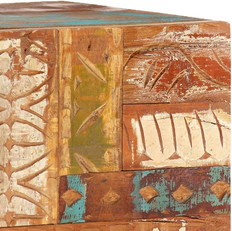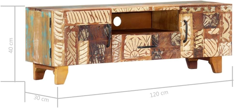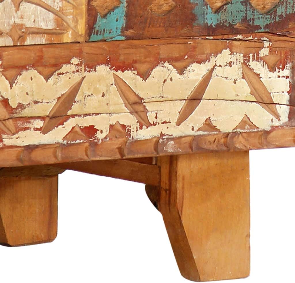- Der farbenfrohe HiFi-Schrank mit handgeschnitztem Muster in Antik-Stil besteht aus massivem Altholz, das aus Balken, Fussböden und Stützbalken von alten abgerissenen Gebäuden stammt. Verschiedene Holzarten wie Sheesham (Palisander), Kiefer, Teak,