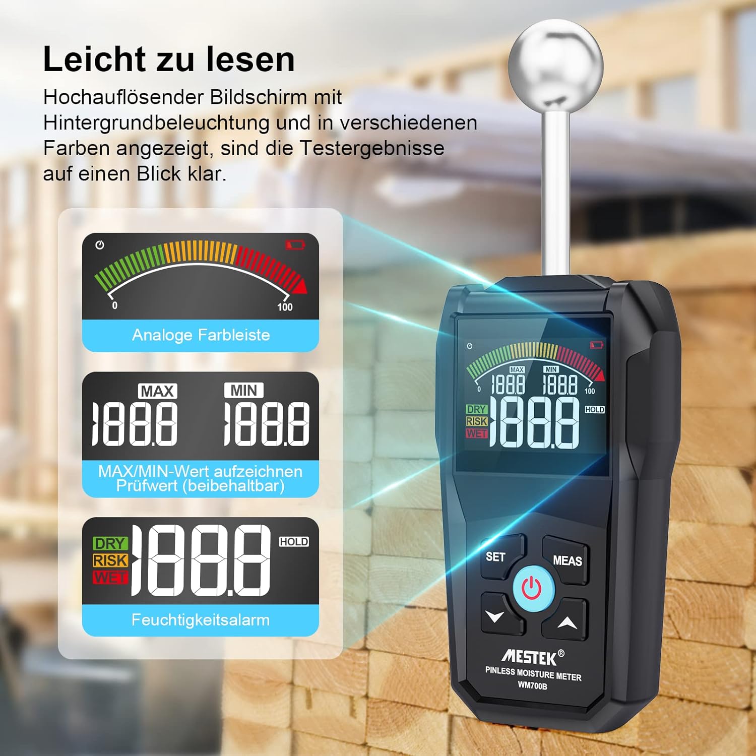 - 【Einfach zu benutzen】 Messtiefe: Max. 40mm Wandtiefe. Einzelpunktmessung kann MAX/MIN-Wert gleichzeitig anzeigen. Nass- und Trockenalarmfunktion - WET/RISK/DRY, die Alarmschwelle kann automatisch entsprechend den Benutzeranforderungen eingestellt werden. Verwenden Sie die Taste "MEAS" für eine Schlüsselkalibrierung nach dem Einschalten.Aktuelle Messwerte können mit der Hold-Funktion aufgezeichnet werden.