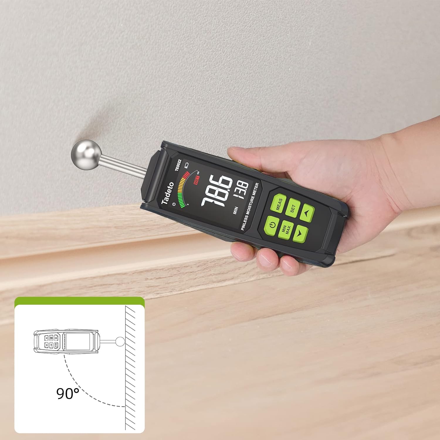 - ✅【Genaue & Zerstörungsfreie Messung】Das Feuchtigkeitsmessgerät verfügt über eine hochpräzise Legierungssonde und einen leistungsstarken Verarbeitungschip für genaue Messungen ohne Beschädigung der Materialoberfläche, einen verlängerten
