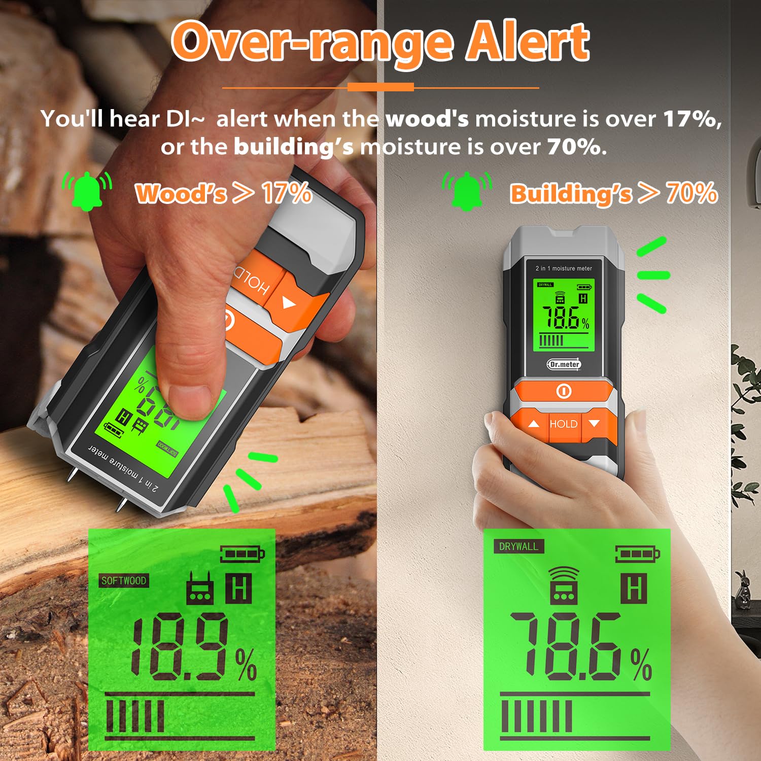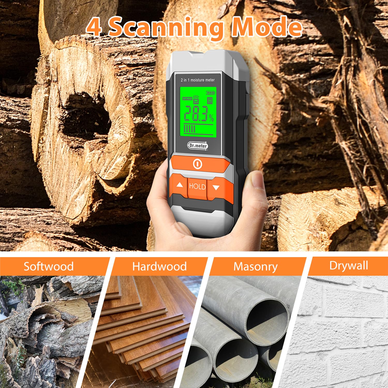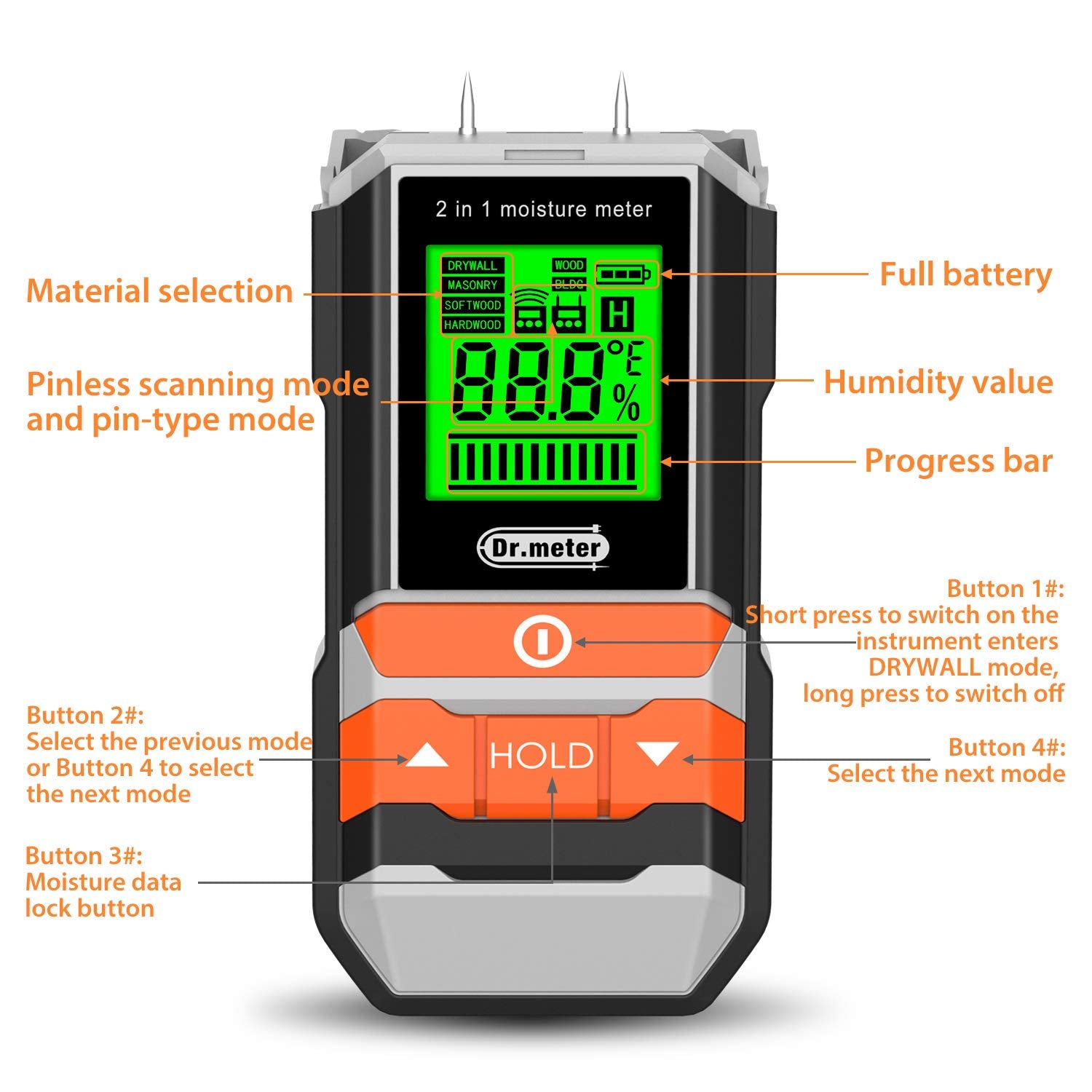 - 【2-in-1-Feuchtemessgerät】 Das 2-in-1-Dr.meter-Feuchtemessgerät bietet ideale Doppelfunktionen von stift und stiftlosem Scannen in einem. Der stiftlose Scanmodus ist ideal für hochwertige Holz- und Baumaterialien. Der Stiftmodus mit schnellerer Reaktion und höherer Genauigkeit eignet sich für alle Arten von Holz und Baumaterialien.