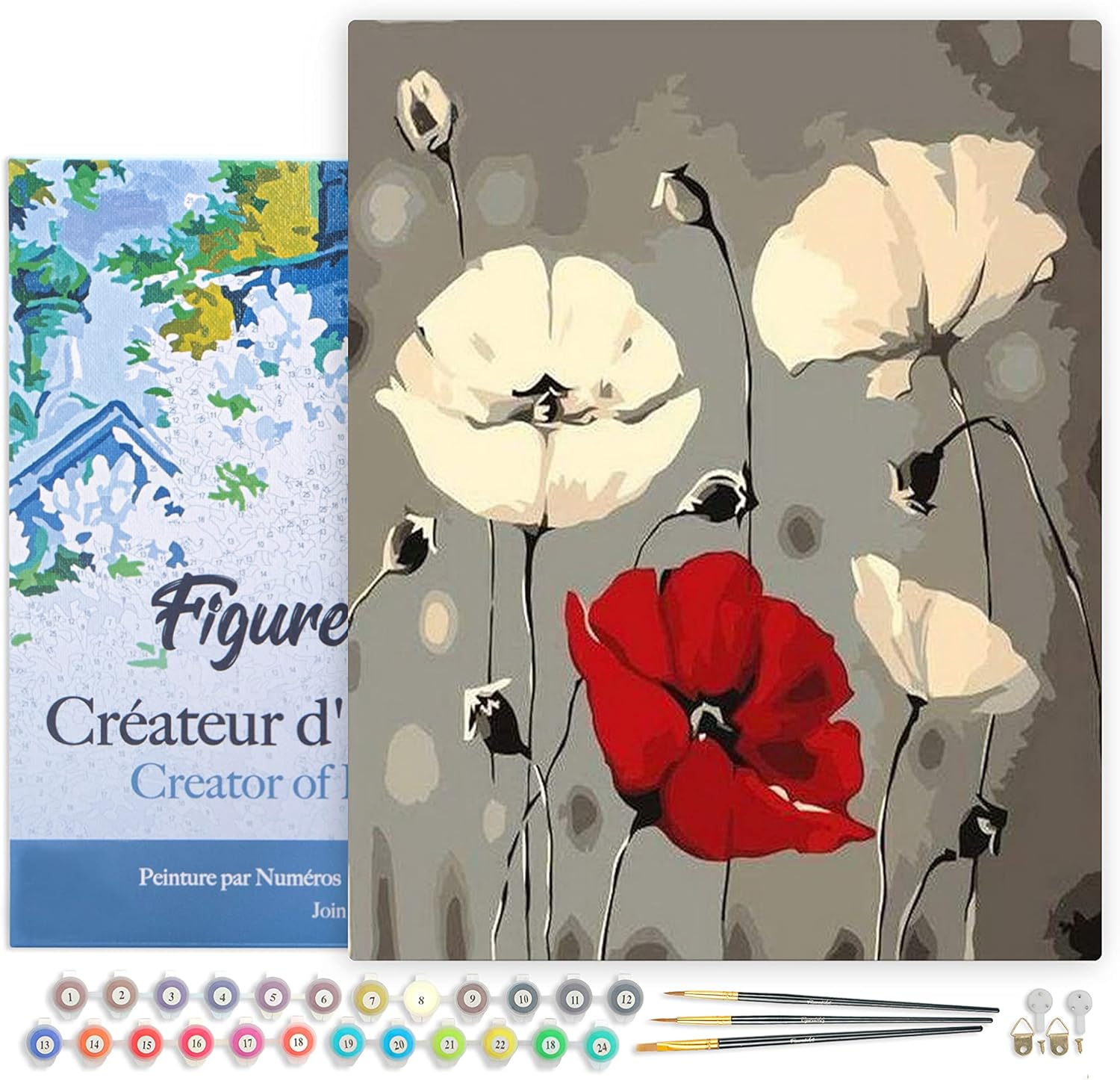 Figured'Art Malen Nach Zahlen Erwachsene Mit Rahmen Rote und weisse Blumen - Paint by Numbers Bastel