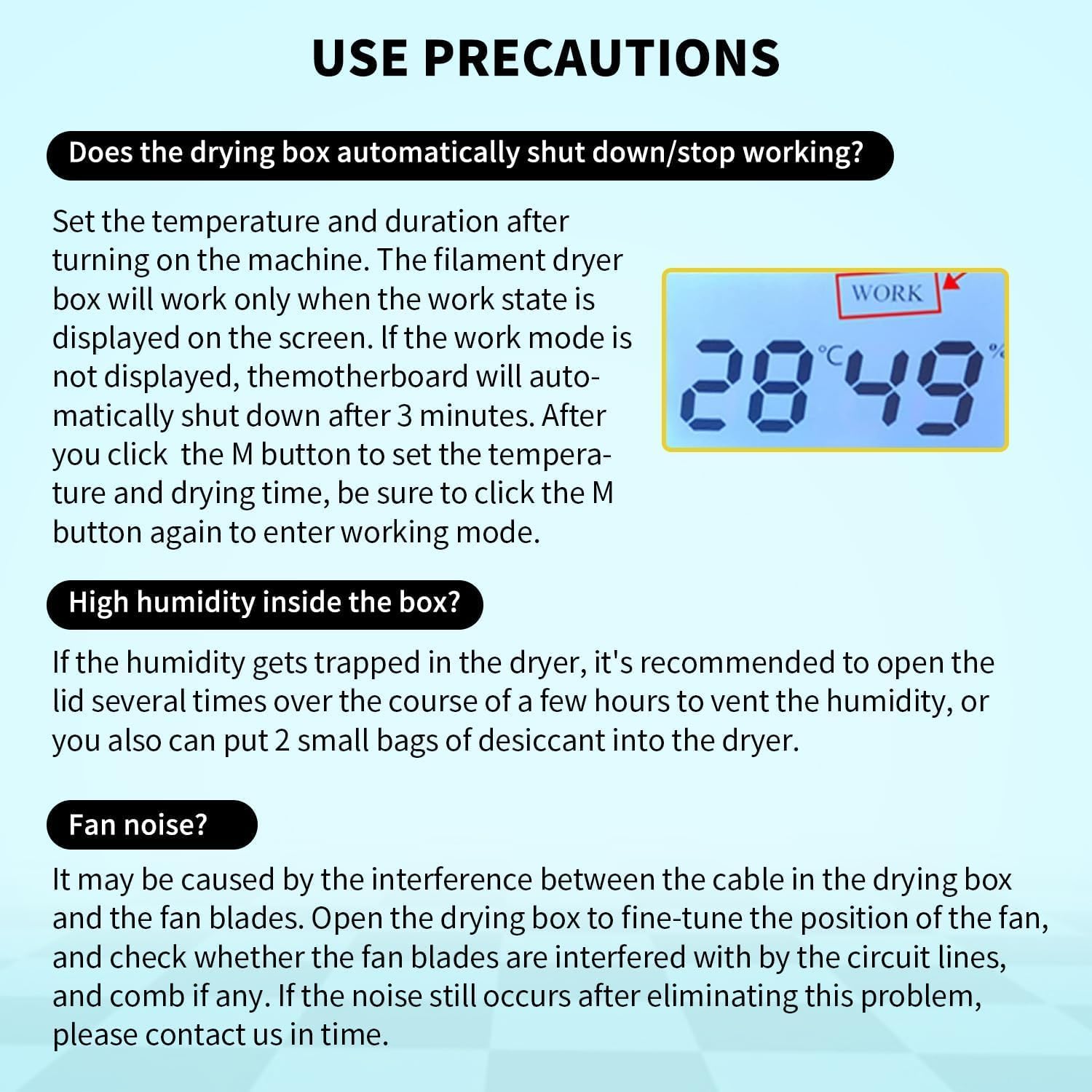 - Touchscreen: 2-Zoll-LCD-Monitor, kann die Luftfeuchtigkeit und Temperatur in der Filament-Aufbewahrungsbox in Echtzeit anzeigen. Einstelltemperatur 40 °C bis 50 °C und Einstellzeit von 6 Stunden bis 12 Stunden.