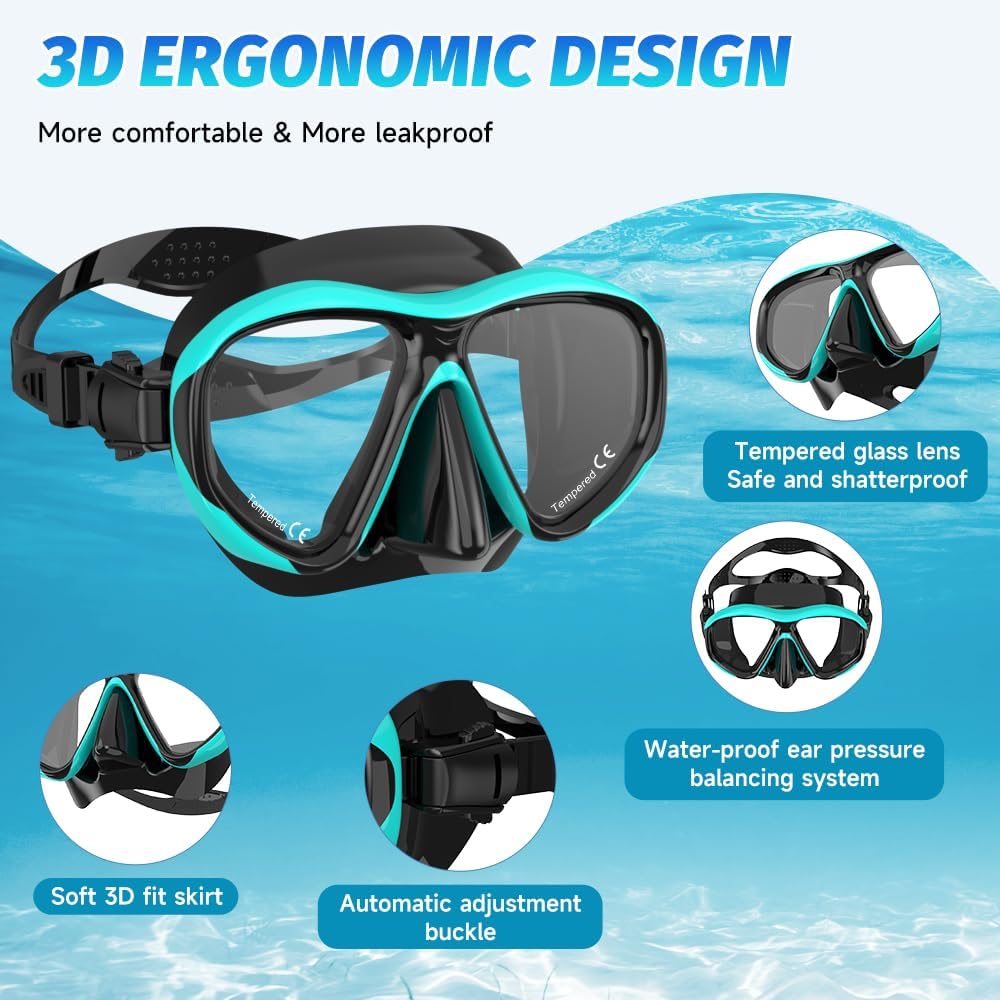 - ANTI-FOG GEHÄRTETES GLAS SCHNORCHELBRILLE: Die Schnorchel-Tauchmaske verfügt über eine Hartglaslinse mit 180° Panoramablick zum Schnorcheln, Schwimmen und Tauchen. Taucherbrille mit ergonomischem Design für maximale Passform mit unterschiedlichen