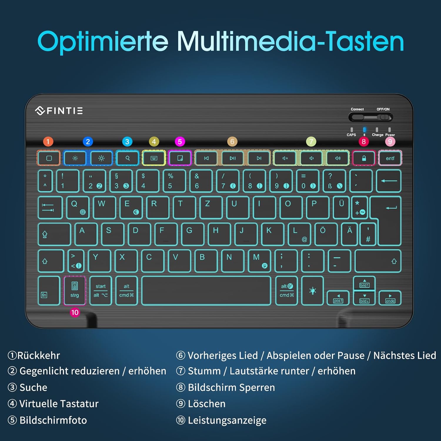 - Lieferumfang: 1 x Fintie kabellos Tastatur, 1 x USB-Ladekabel, 1 x Bedienungsanleitung. Bluetooth Version: Bluetooth V5.1; Arbeitsbereich: 10Meter