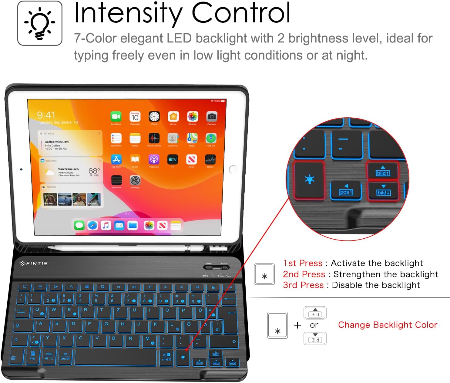 - Die hintergrundbeleuchtete Tastatur mit 2 Helligkeitsstufen und 7 Farbeinstellungen macht Ihre Tastatur wunderschön und einzigartig. Es macht möglich, dass die Tasten bei schwachem Licht trotzdem scharf, hell und gut lesbar sind, und vermittelt
