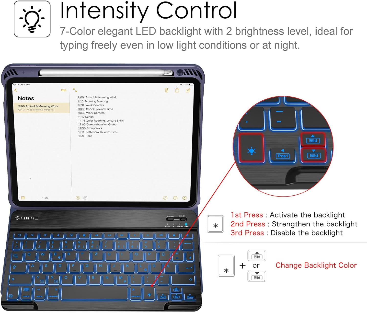 - Wird mit magnetisch abnehmbarer, schmaler (7 mm) und leichter Bluetooth-Tastatur mit 10m Reichweite geliefert. Das superflache Design bietet maximalen Schutz bei minimalem Gewicht (Dicke nur 0,96cm). Mit dem verstellbaren Ständer steht Ihr iPad sicher