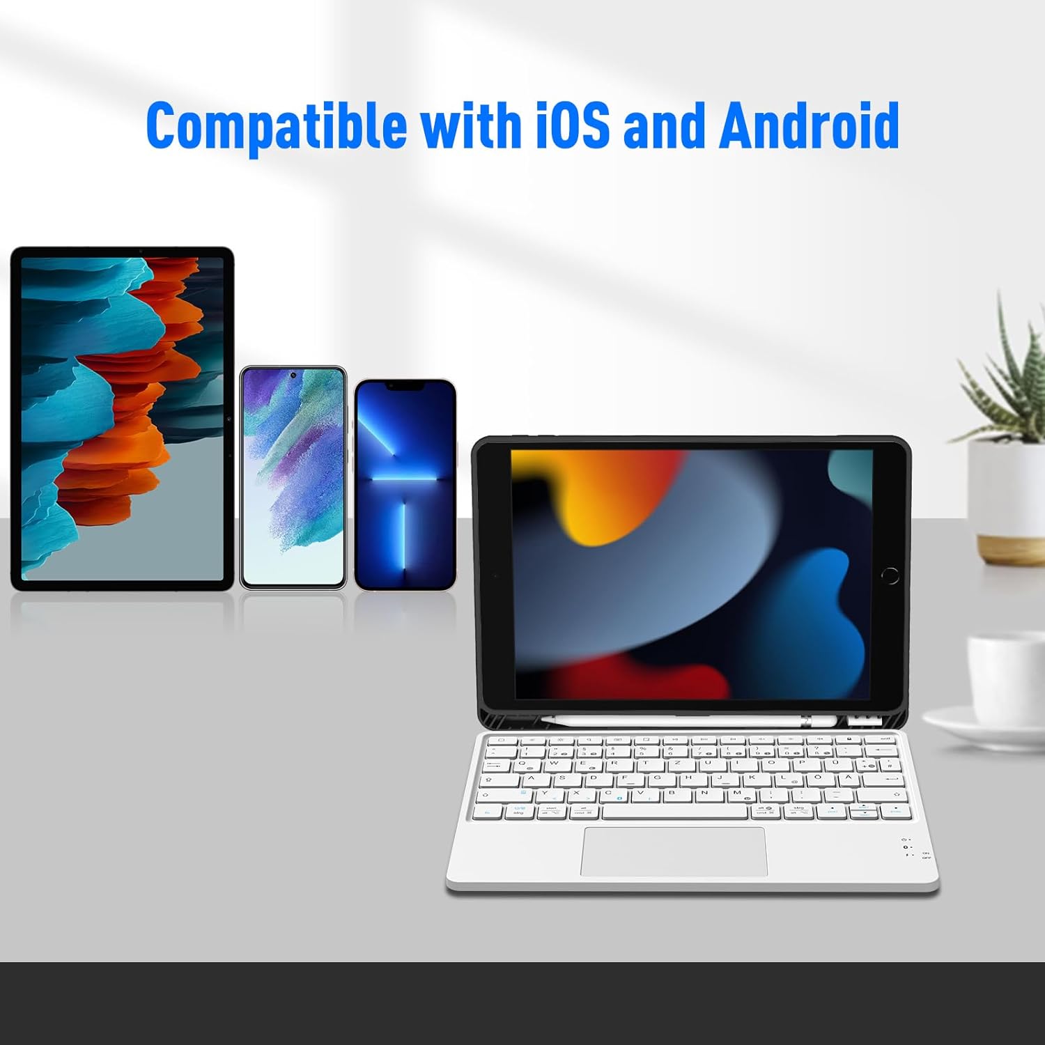 - 【Kompatibilität】 Bluetooth Tastatur kompatibel mit iOS- und Android-Betriebssystemen, einschliesslich iPad 10.2 / iPad Air / iPad Pro / iPad 9.7 / iPad Mini / iPhone / Android-Tablets wie Samsung Galaxy Ta / Lenovo Tab / Huawei Tab.