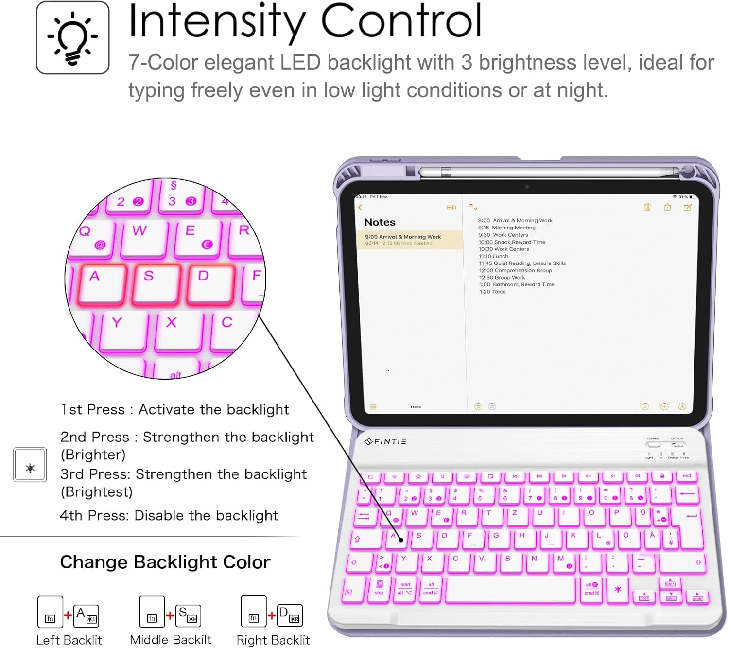 - Die hintergrundbeleuchtete Tastatur mit 3 Helligkeitsstufen und 7 Farbeinstellungen macht Ihre Tastatur wunderschön und einzigartig. Es macht möglich, dass die Tasten bei schwachem Licht trotzdem scharf, hell und gut lesbar sind, und vermittelt