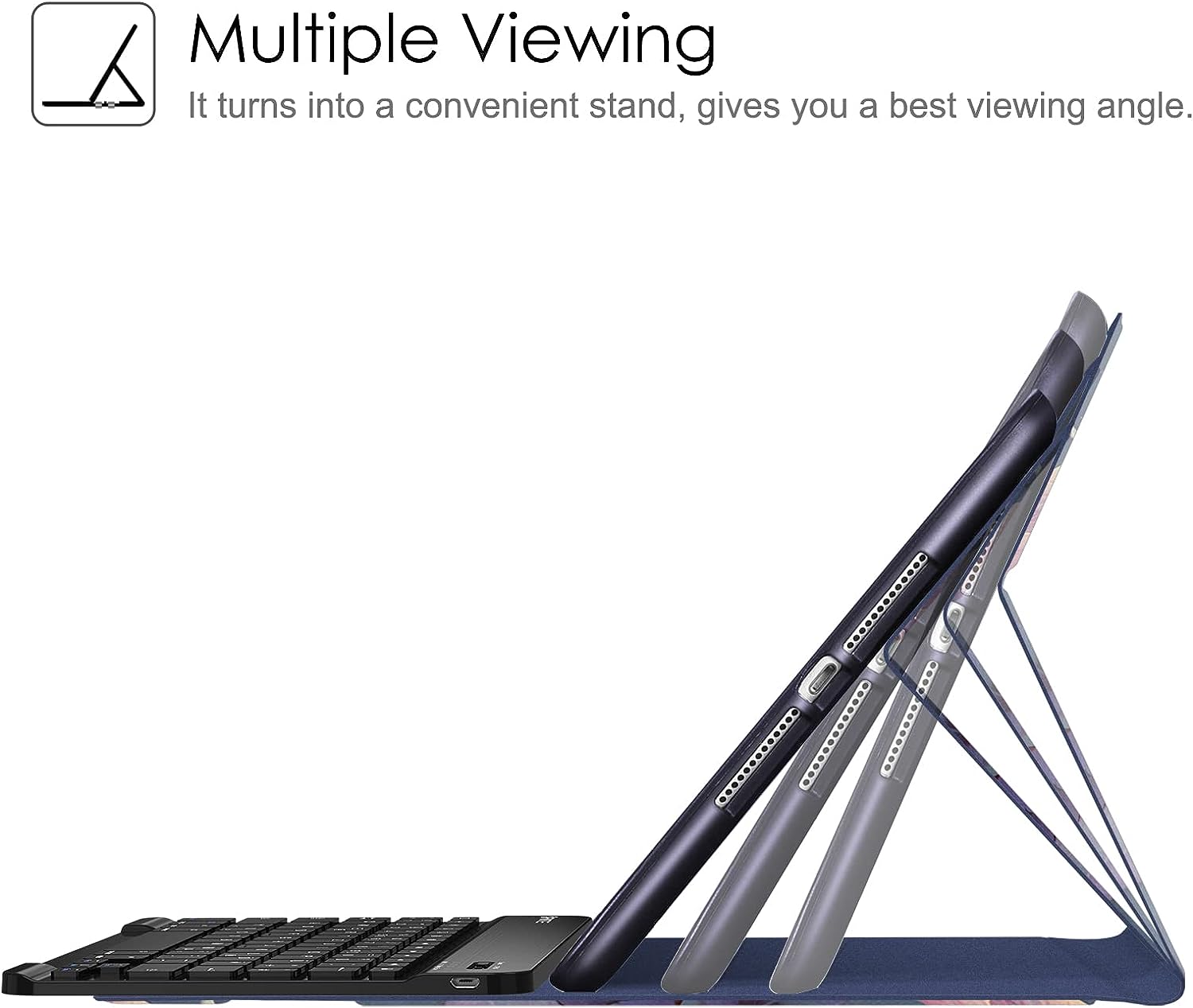 • Superschlankes Design bietet umfassenden Schutz und hat nur ein leichtes Gewicht. Der verstellbare Ständer hält Ihr iPad sicher im Querformat. Die Reichweite der Bluetooth Tastatur ist 10 Meter. Sie verbindet problemlos und schnell mit Ihrem iPad und