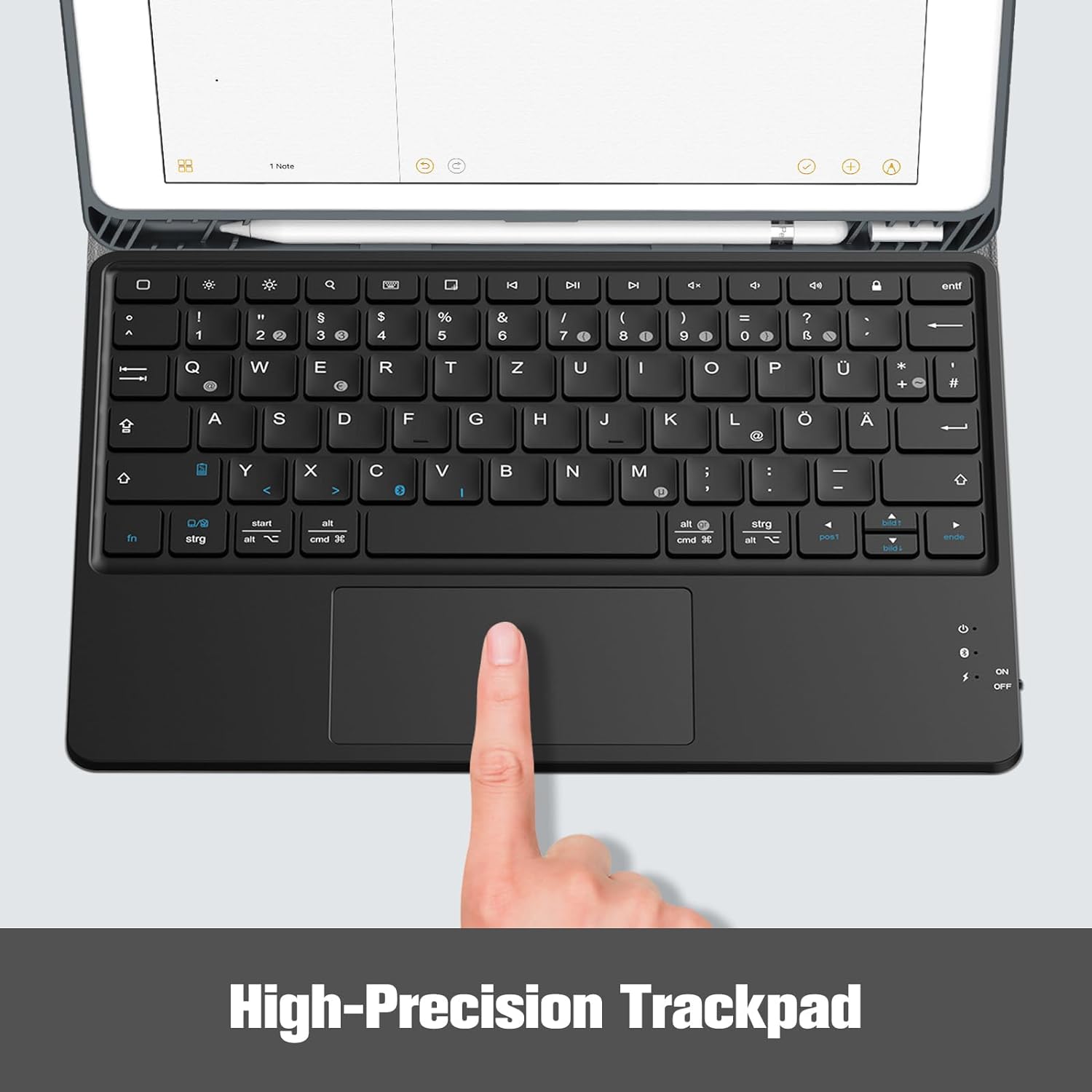 - Tastatur mit Trackpad - Mit dem eingebauten Touchpad können Sie Ihr Tablet durch mehrere Gesten kontrolieren, ohne eine Maus, besser und praktischer zur arbeiten und spielen. Die Reichweite der Bluetooth Tastatur ist 10 Meter, verbindet unbehindert mit