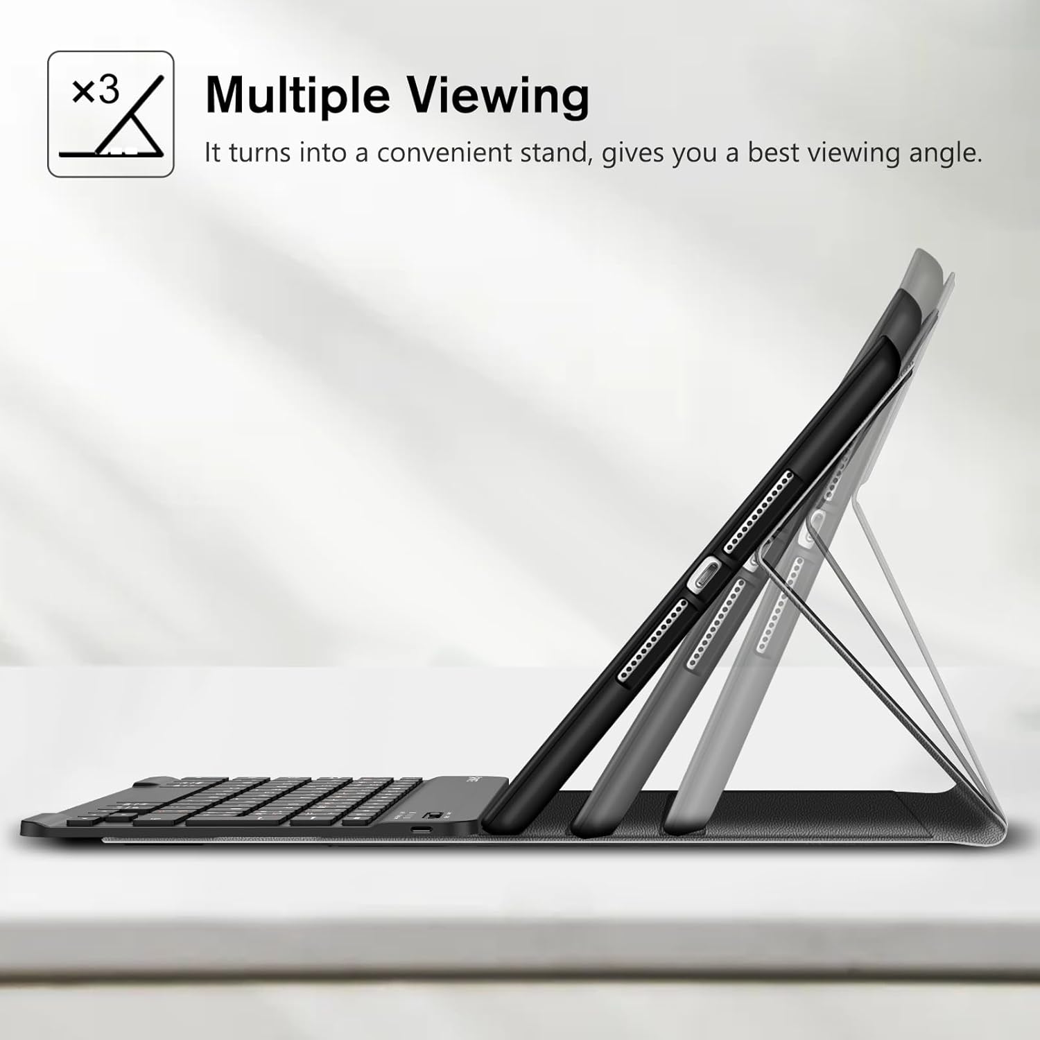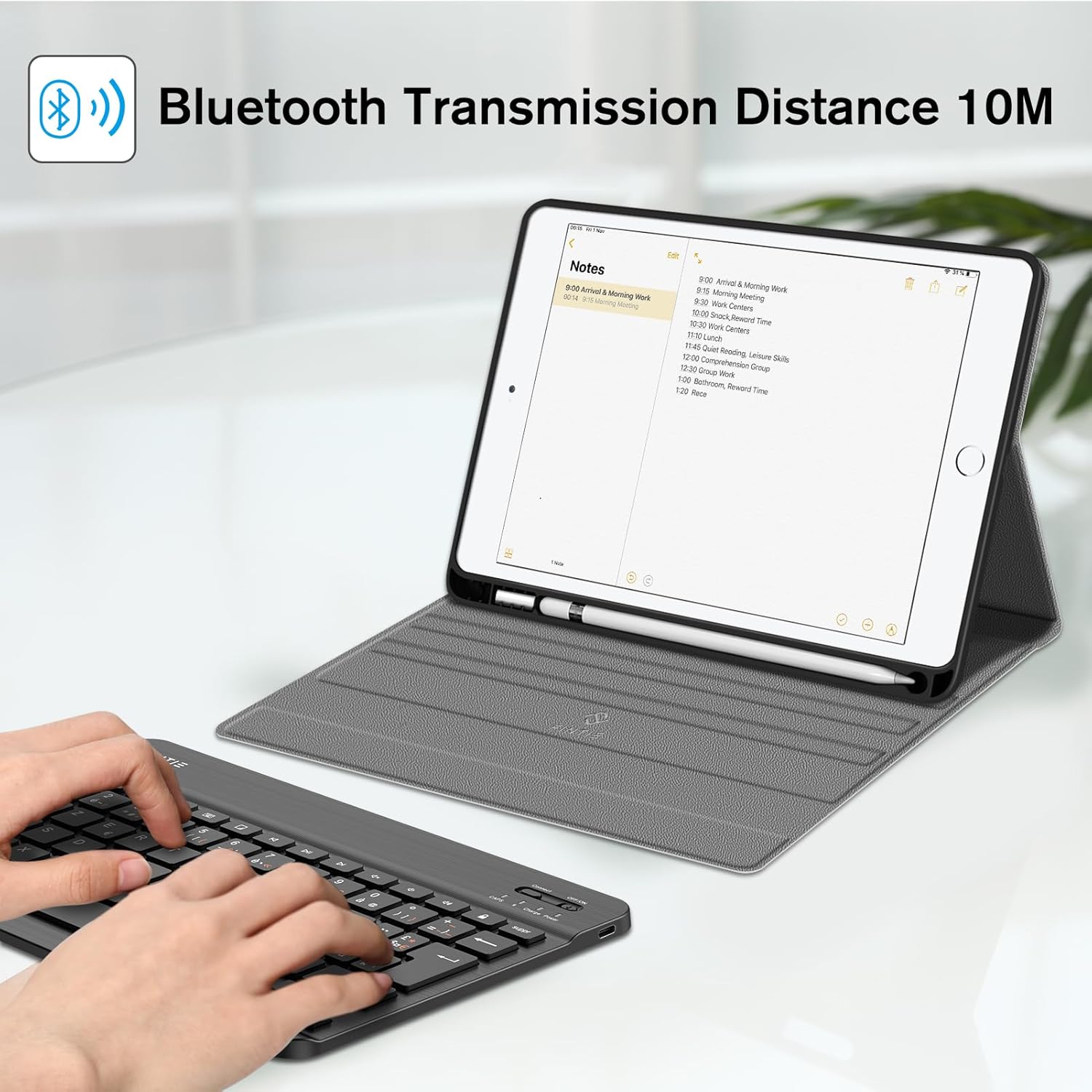 - Superschlankes Design bietet einwandfreien Schutz mit nur geringem Gewicht. Der verstellbare Ständer hält Ihr iPad sicher im Querformat. Die Reichweite der Bluetooth Tastatur ist 10 Meter, verbindet mit Ihrem iPad und anderen iOS Geräten (mit