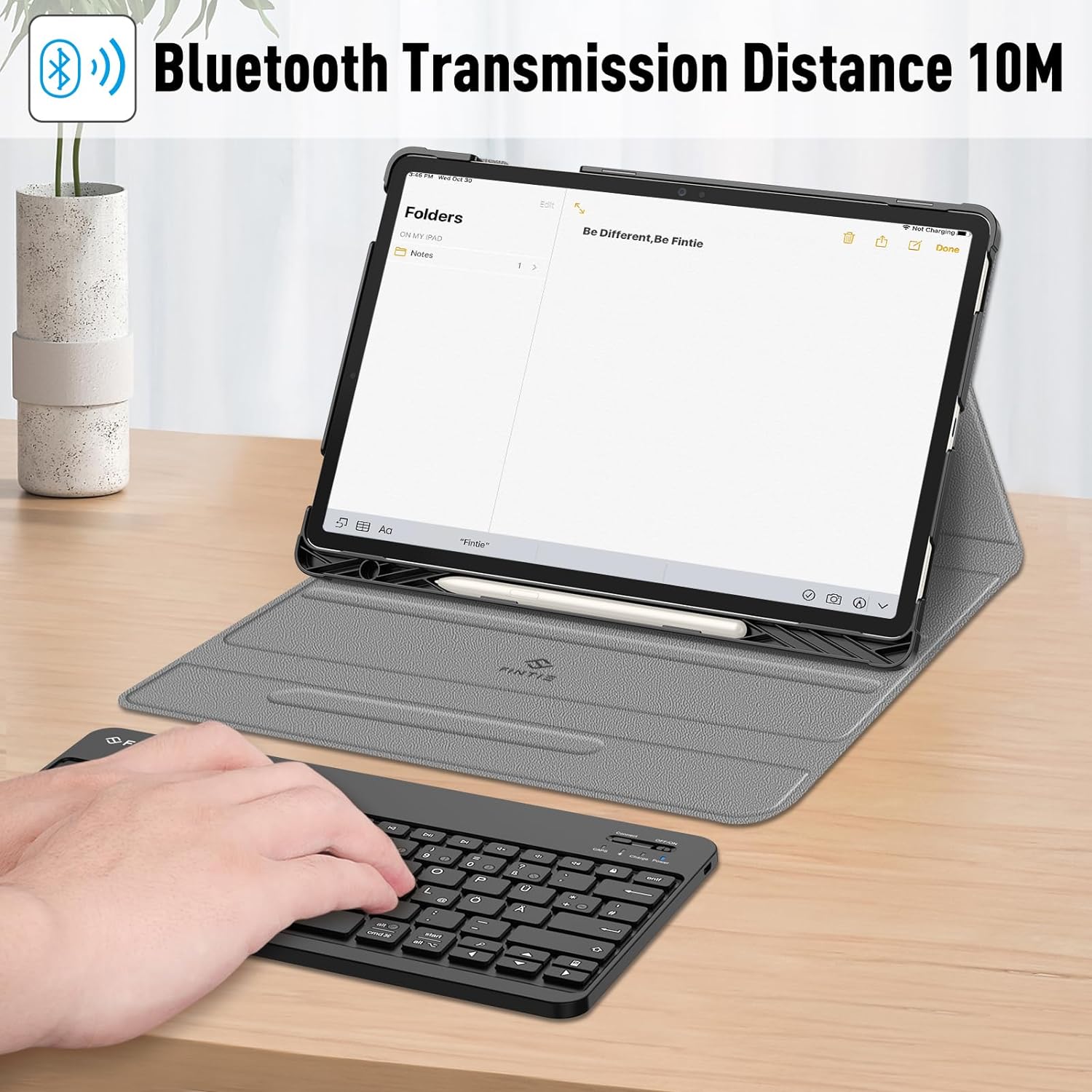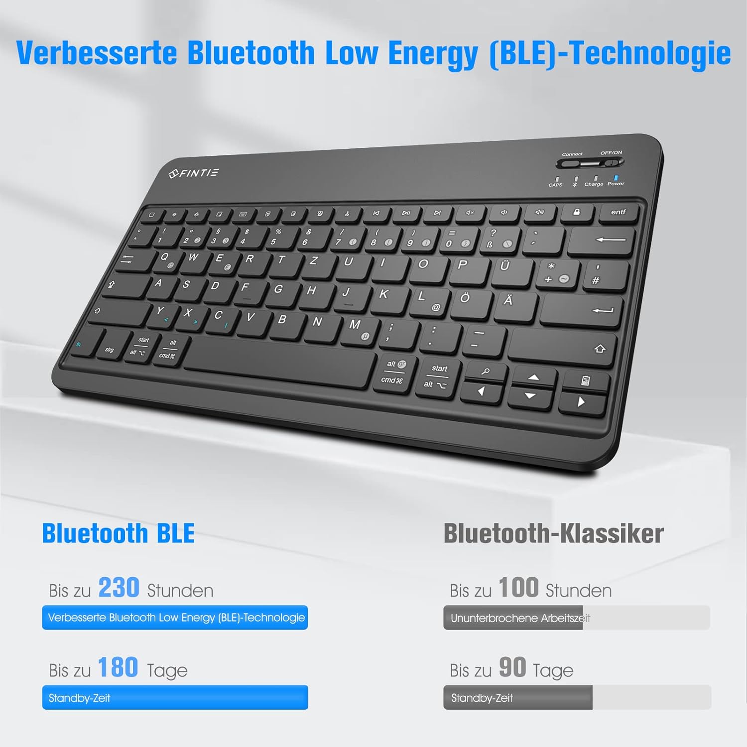 - Verstellbare Stellhalterung - Hinteres Cover kann zu einem Ständer verwandelt. Drei Winkel können eingestellt werden. Die Reichweite der Bluetooth Tastatur ist 10 Meter. Sie verbindet problemlos mit Tablet und anderen Android/iOS Geräten (mit