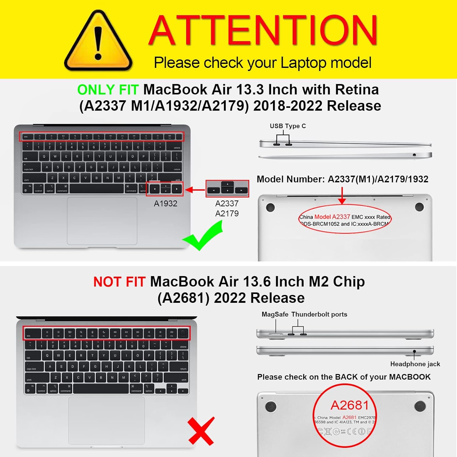 - Kompatibel mit MacBook Air 13" (2020 2019 2018 Freisetzung) A2337(M1) / A2179 / A1932 mit Retina Display und Touch ID. Nicht kompatibel mit anderen Modellen. Bitte überprüfen Sie vor dem Kauf die Modellnummer auf der Rückseite Ihres Laptops.