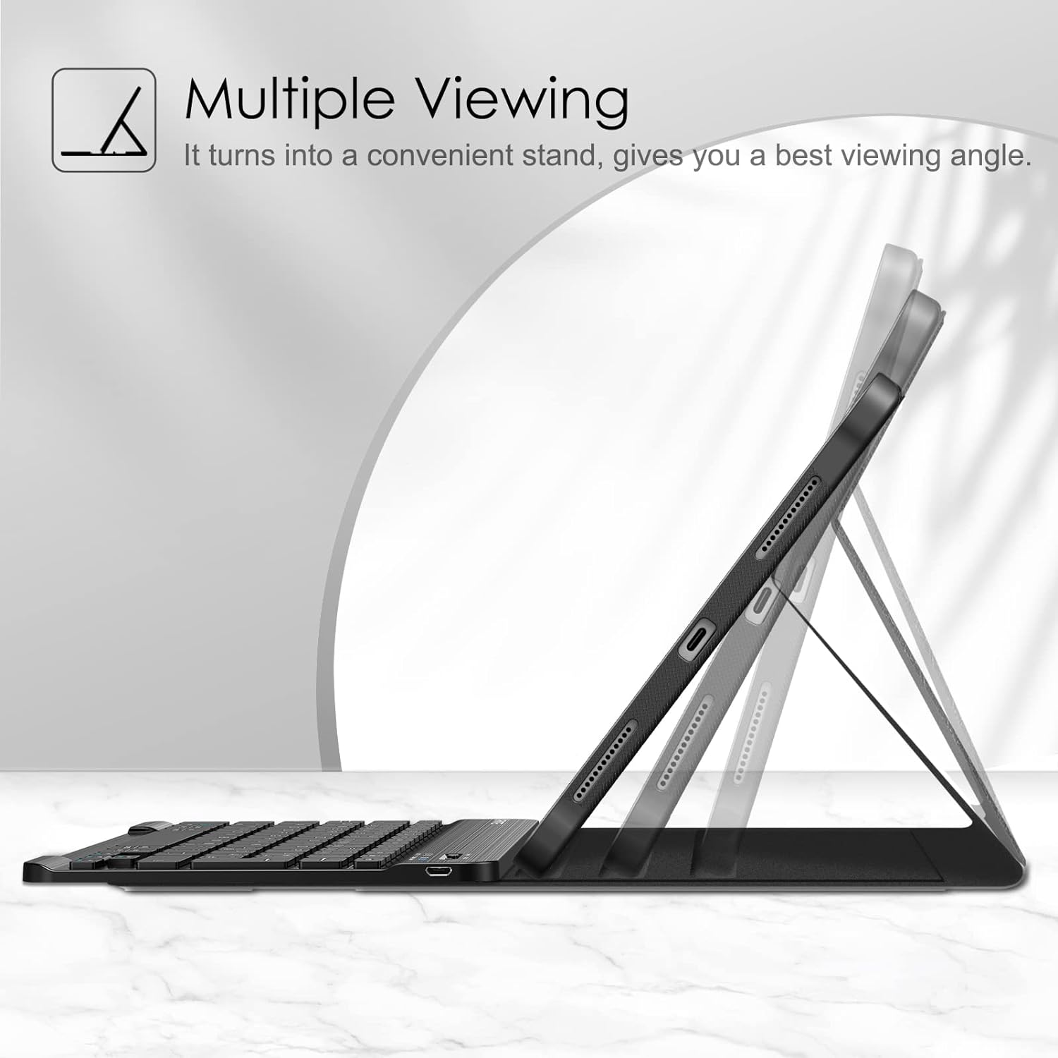 - Superschlankes Design bietet umfassenden Schutz und hat nur ein leichtes Gewicht. Der verstellbare Ständer hält Ihr iPad Pro 11 sicher im Querformat. Die Reichweite der Bluetooth Tastatur ist 10 Meter. Sie verbindet problemlos und schnell mit Ihrem