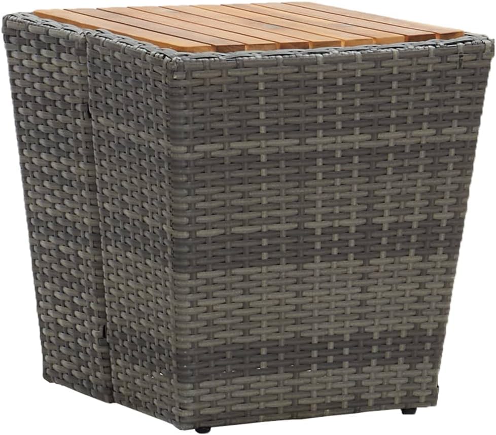 - đżăProduktspezifikationenăFarbe: Grau und helles Holz (Tischplatte). Material: PE-Rattan, Stahl. Material Tischplatte: Massives Akazienholz. Abmessungen: 41,5 x 41,5 x 43 cm (L x B x H). Kompaktes Design. Zusammenbau erforderlich: Ja.