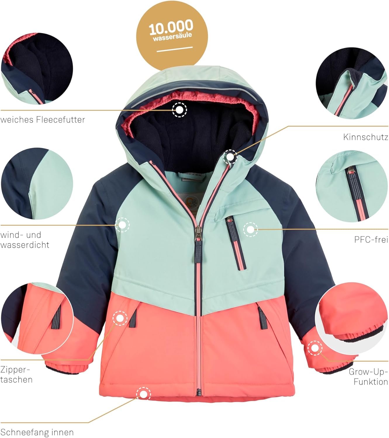 PRODUKTBESCHREIBUNGEN Die neue Kollektion von First Instinct by killtec zeichnet sich durch cleveres Design und liebevolle Details aus. Mit der Skijacke im angesagten Colourblock Design und mit kleinen reflektierenden Elementen macht der Winter doppelt Spass. Durch die Grow-Up-Funktion lassen sich die Ärmel um ca. 4 cm verlängern, somit ist die Jacke auch noch in der nächsten Kleidergrösse einsetzbar. Sie hat verschweisste Nähte und ist 100% wasser- und winddicht. Gleichzeitig ist die Jacke atmungsaktiv. Mit kuscheligem Fleece gefüttert, hält sie schön warm. Der Gummizug an der Kapuze sorgt für einen guten Sitz. Die elastischen Ärmelbündchen und der Schneefang verhindern das Eindringen von Wind und Nässe. Die vier Taschen sind durch Zipper verschliessbar. Mit dem praktischen, eingenähten Namensetikett zum Beschriften geht die Jacke in der Kita nicht so leicht verloren. killtec liegt es besonders am Herzen, die Kollektionen nachhaltiger und zukunftsfähiger zu machen. Diese Winterjacke ist daher PFC-frei.
