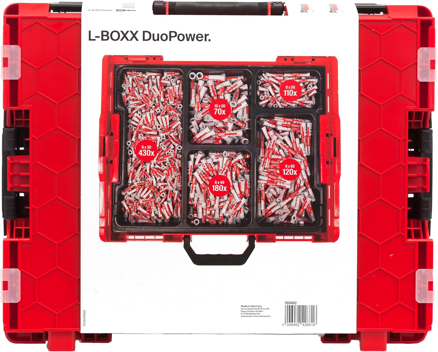 - Lieferumfang: 1 x L-Boxx DUOPOWER, Kiste mit insgesamt 910 DuoPower Dübel (430 Stk. 6 x 30, 110 Stk. 6 x 50, 180 Stk. 8x40, 120 Stk. 8 x 65, 70 Stk. 10 x 50) von fischer