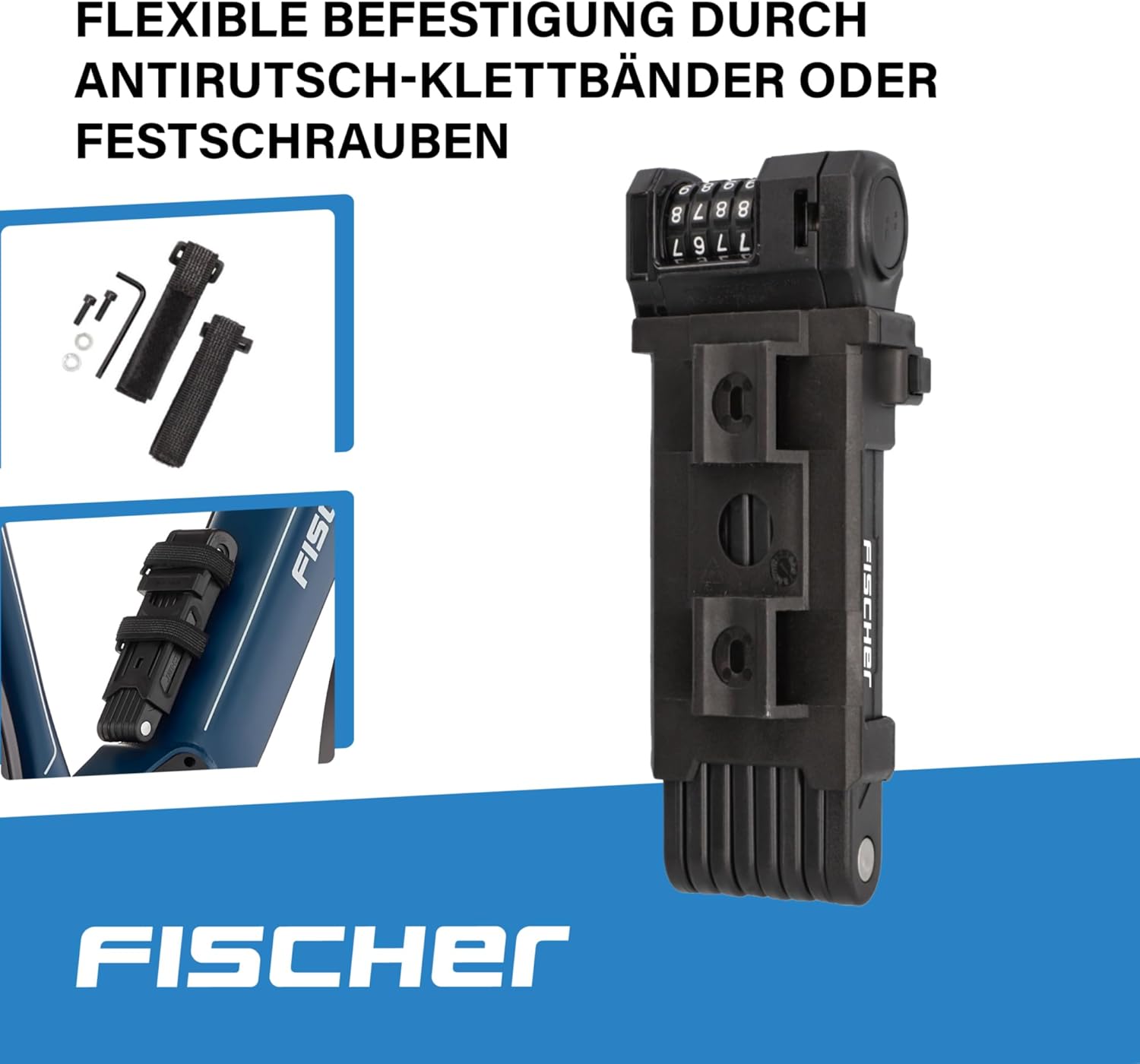 - PRAKTISCH: Platzsparend angebracht wird das 110 cm faltbare Schloss in der mitgelieferten Halterung, die entweder mittels gummierter Antirutsch-Klettbänder direkt am Rahmen oder mit den enthaltenen Schrauben an der Flaschenhalteraufnahme am
