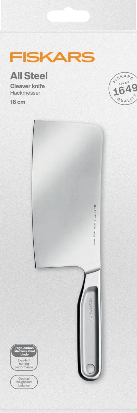 - Lieferumfang: 1x Fiskars Hackmesser, Gesamtlänge: 28,1 cm, Klingenlänge: 16 cm, Material: Japanischer Aichi-Hartstahl, All Steel, 1062885