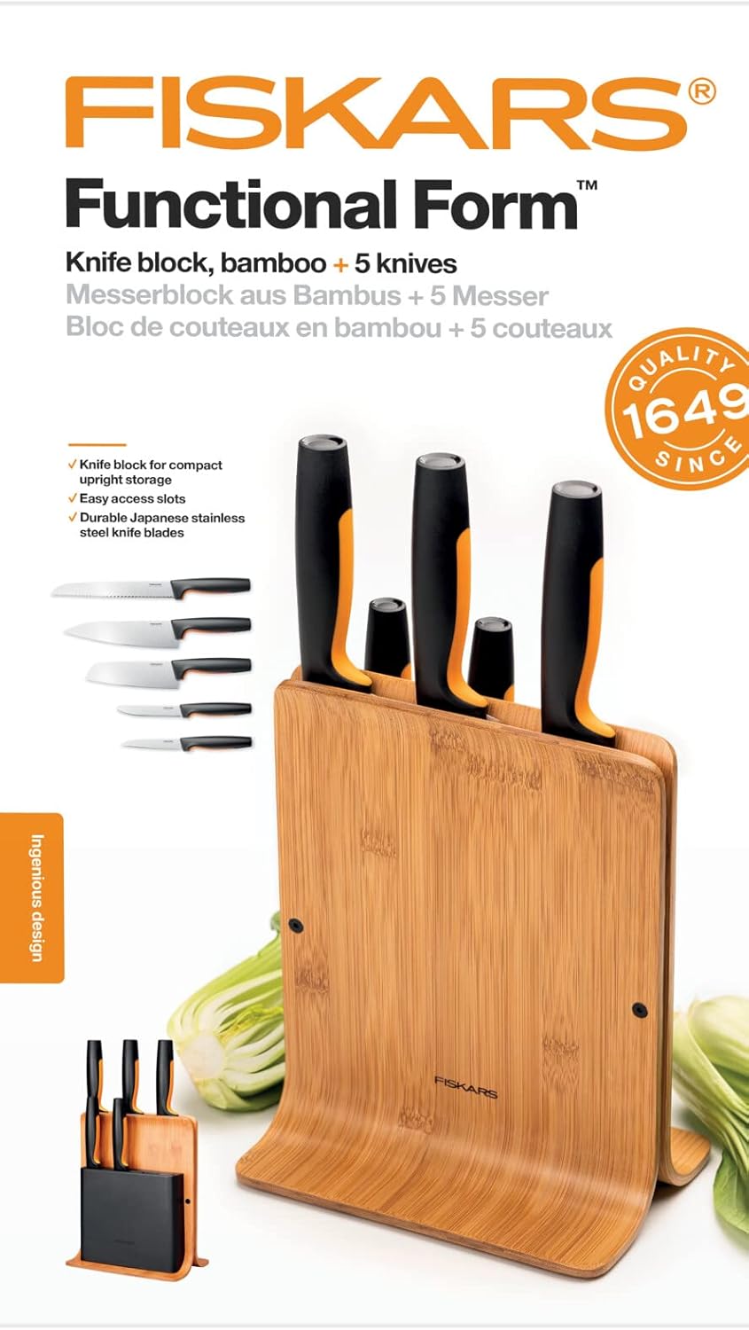 Fiskars Bambus Design-Messerblock mit 5 Messern, Functional Form, Inklusive Gemüsemesser, Tomatenmes