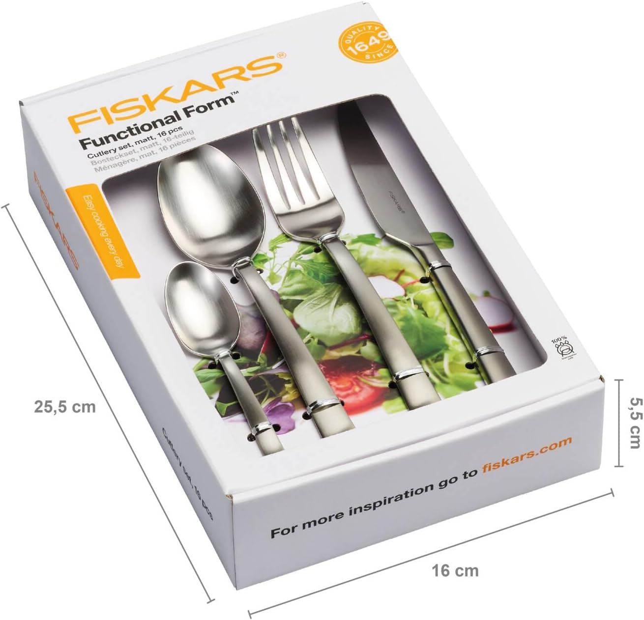 • Lieferumfang: 1x Fiskars Besteck-Set, Functional Form, 16-teilig: 4x Messer, 4x Gabeln, 4x Löffel, 4x Teelöffel, Gewicht: 828 g, Material: Qualitätsstahl, Farbe: Silber/Matt, 1002958