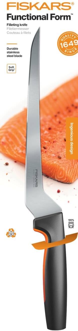• Lieferumfang: 1x Fiskars Functional Form Filetiermesser, Klingenlänge: 22 cm, Gesamtlänge: 35 cm, Gewicht: 80 Gramm, Material: Japanischer Edelstahl/Kunststoff, Farbe: Silber/Schwarz/Orange, 1057540