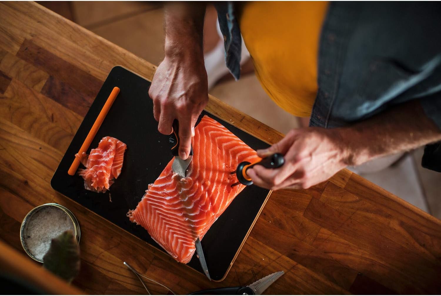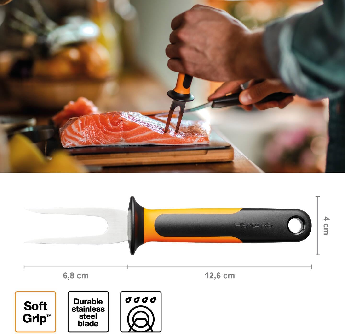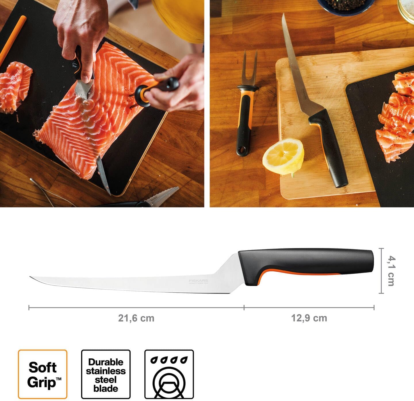 - Lieferumfang: 1x Fiskars Functional Form Fischbearbeitungs-Set, 3-tlg., 1 Filetiermesser, 1 Fischspiess, 1 Fischgrätenpinzette, Material: Japanischer Edelstahl/Kunststoff, Farbe: Silber/Schwarz/Orange, 1057560