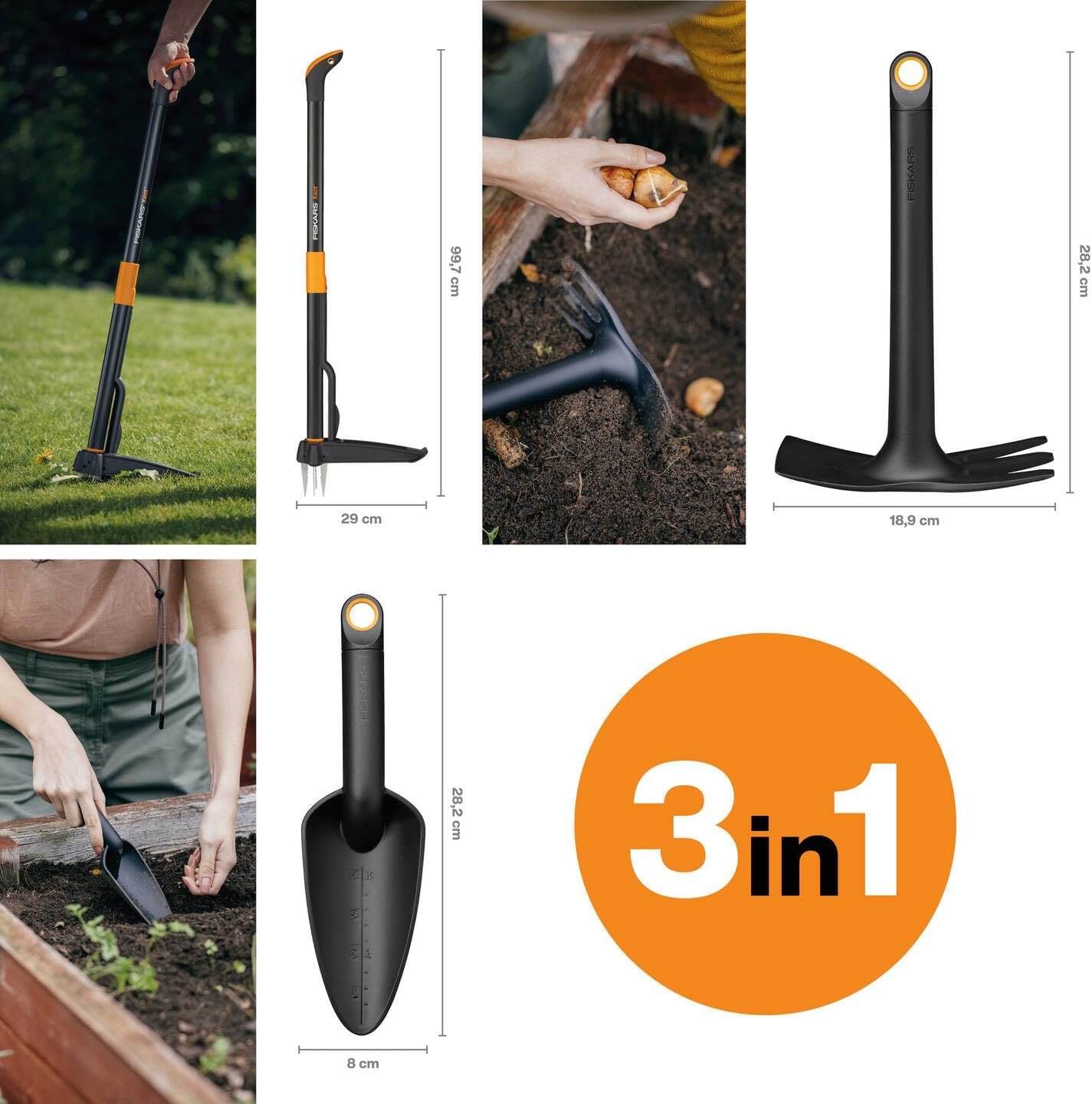 • Lieferumfang: 1x Fiskars Xact Unkrautstecher, Durchmesser: 3 cm, Rostfreier Stahl/Kunststoff, 1x Solid Kombihacke, Material: GfK, 1x Solid Blumenkelle, Material: GfK, 1077307