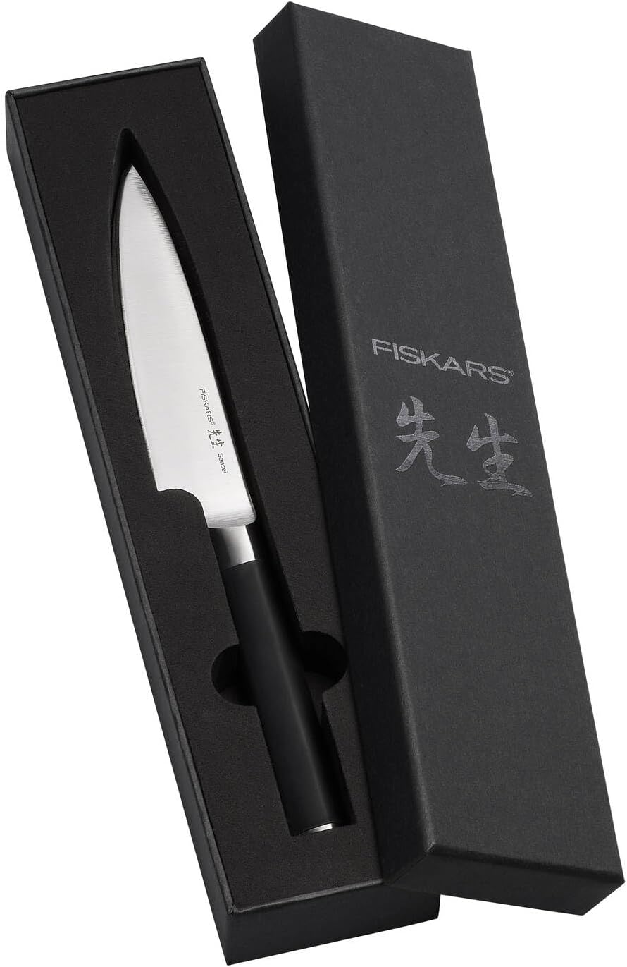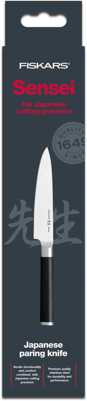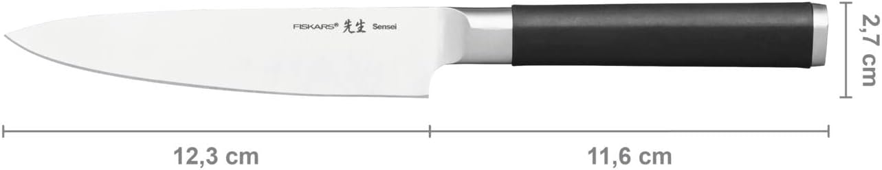 - Lieferumfang: 1x Fiskars Sensei Gemüsemesser, Klingenlänge: 12 cm, Gesamtlänge: 23,9 cm, Gewicht: 85 Gramm, Material: Rostfreier Stahl mit hohem Kohlenstoffgehalt/Kunststoff, Farbe: Silber/Schwarz, 1024272