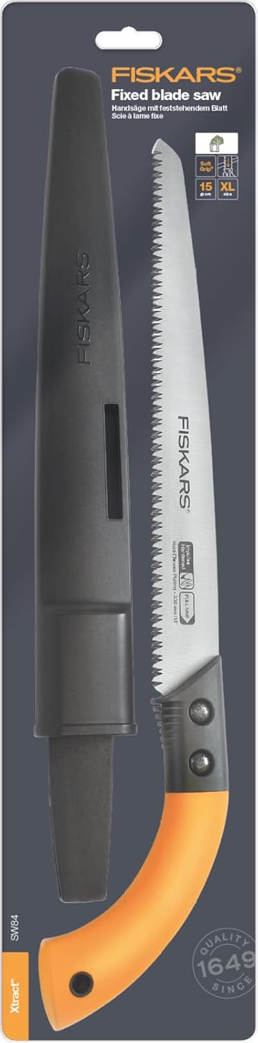 • Lieferumfang: 1x Fiskars Handsäge SW84, Inklusive Kunststoff-Köcher, Gesamtlänge: 49 cm, Sägeblatt: 33 cm, Gewicht: 400 g, Material: Rostfreier Stahl/Kunststoff, Farbe: Schwarz/Orange, 1001620